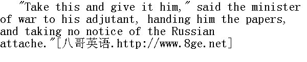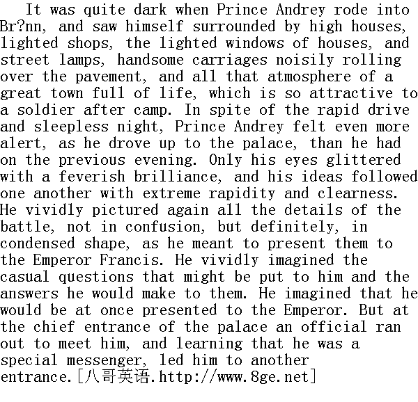 当安德烈公爵乘车驶入布吕恩的时候, 天色已经黑了, 他看见周围有一栋栋高大的楼房, 商店和住宅的窗户里灯火通明, 一排排路灯闪烁着耀眼的光辉, 豪华的马车沿着石板马路驶行, 发出辚辚的响声, 这正是热热闹闹的大城市的气氛, 对那个度过一段兵营生涯的军人来说, 这种气氛真是十分诱人的。虽然安德烈公爵快马加鞭, 彻夜不眠, 但是在他驶近皇宫时, 他觉得自己比前夜精神更加抖擞。只是他那对眼睛闪烁着狂热之光。他的心绪万千, 接踵而至, 思路极其敏捷而且清晰。他的思想上又很生动地浮现出作战的详细情节, 这种想象已经不是模糊的, 而是合乎逻辑的。他想简单而扼要地向弗朗茨皇帝禀告实情。他的思想上很生动地浮现出一些偶然提出的问题以及他对这些问题作出的回答。他原以为马上有人带他去觐见皇帝。但在皇宫正门前, 有一名官员向他跑来, 一眼认出他是信差, 就把他领到另一道门前。 "Turning to the right out of the corridor, Euer Hochgeboren, you will find the adjutant on duty," the official said to him. "He will conduct you to the minister of war." "EuerHochgeboren ①, 沿着走廊向右转, 您可以找到值班的侍从武官, "这名官员对他说, "他会带您去见军政大臣。" ①德语: 大人。 The adjutant on duty, meeting Prince Andrey, asked him to wait, and went into the war minister. Five minutes later the adjutant returned, and with marked courtesy, bowing and ushering Prince Andrey before him, he led him across the corridor to the private room of the war minister. The adjutant, by his elaborately formal courtesy, seemed to wish to guard himself from any attempt at familiarity on the part of the Russian adjutant. The joyous feeling of Prince Andrey was considerably damped as he approached the door of the minister's room. He felt slighted, and the feeling of being slighted passed instantaneously without his being aware of it himself-into a feeling of disdain, which was quite uncalled for. His subtle brain at the same instant supplied him with the point of view from which he had the right to feel disdain both of the adjutant and the minister of war. "No doubt it seems to them a very simple matter to win victories, never having smelt powder!" he thought. His eyelids drooped disdainfully; he walked with peculiar deliberateness into the war minister's room. This feeling was intensified when he saw the minister of war sitting at a big table, and for the first two minutes taking no notice of his entrance. The minister of war had his bald head, with grey curls on the temple, held low between two wax candles; he was reading some papers, and marking them with a pencil. He went on reading to the end, without raising his eyes at the opening of the door and the sound of footsteps. 值班的侍从武官接待了安德烈公爵, 请他等候片刻, 这名侍从武官便到军政大臣那儿去了。过了五分钟, 侍从武官走回来, 他特别恭敬地弯腰鞠躬, 让安德烈公爵在前面走, 带领他穿过走廊进入军务倥偬的军政大臣的办公室。侍从武官文质彬彬, 非常谦虚, 仿佛要俄国副官不必对他太客气似的。当他走到军政大臣办公室门前的时候, 他那愉快的感觉大大地冲淡了。他觉得自己遭受到侮辱, 而这种受辱的感觉就在他不知不觉的一瞬间变成了毫无道理的蔑视感。就在这一瞬间, 随机应变的头脑向他暗示一个有权蔑视副官和军政大臣的理由。"他们大概以为不闻火药味也可以不费吹灰之力地赢得胜利啊!"他想了想。他那双眼睛轻蔑地眯缝起来。他特别缓慢地走进了军政大臣的办公室。当他看见军政大臣坐在一张宽大的办公桌前、头两分钟不理睬走进来的人时, 他这种感觉就变得愈益强烈了。这个军政大臣把他那夹在两支蜡烛中间、两鬓斑白的秃头低垂下来, 一面阅读文件, 一面用铅笔做记号。当房门敞开、听见步履声时, 他连头也不抬, 继续把文件看完。