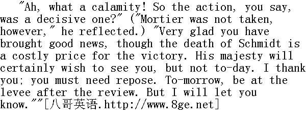 哎, 多么不幸啊!您说, 这是一场决定性的战役吗?但是莫蒂埃还没有被抓起来(他想了想。)。虽然施米特阵亡是为赢得胜利而付出的高昂代价, 但是我非常高兴, 您带来了好消息。陛下也许很想和您见面, 但是并不是今天。我感谢您, 去休息休息。明天阅兵后您来朝拜吧。最好还是我来通知您。" The stupid smile, which had disappeared while he was talking, reappeared on the war minister's face. 谈话时已经消失的愚蠢的微笑又在军政大臣脸上流露出来。 "Au revoir, I thank you indeed. His majesty the Emperor will most likely wish to see you," he repeated, and he bowed his head." 再见, 我很感谢您。国王也许很想和您见面。"他重说一遍, 低下头去。 As Prince Andrey left the palace, he felt that all the interest and happiness that had been given him by this victory had been left behind by him now in the indifferent hands of the minister and the formal adjutant. The whole tenor of his thoughts had instantaneously changed. The battle figured in his mind as a remote, far-away memory. 当安德烈公爵从皇宫里走出来的时候, 他觉得, 胜利给他带来的一切利益和幸福现今已被他抛弃, 并且交给军政大臣和谦恭的副官的冷冰冰的手中了。他的全部思想转瞬之间改变了。他仿佛觉得这场战斗已是久远的往事的回忆。