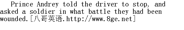 安德烈公爵吩咐手下人停步, 向一名士兵询问, 他们是在什么战役中负伤的。 "The day before yesterday on the Danube," answered the soldier. Prince Andrey took out his purse and gave the soldier three gold pieces." 前天在多瑙河上负伤的。"士兵回答。安德烈公爵掏出钱包把三枚金币交给士兵。 "For all," he added, addressing the officer as he came up. "Get well, lads," he said to the soldiers, "there's a lot to do yet."" 是给你们大家的, "他向那个朝他跟前走来的军官补充说。"伙伴们, 养好伤吧, "他把脸转向士兵们说道, "还有许多仗要打啊。" "What news?" asked the officer, evidently anxious to get into conversation." 副官先生, 怎么样?有什么消息?"军官问道, 看起来, 他想畅谈一番。 "Good news! Forward!" he called to the driver, and galloped on." 有好消息啊!前进。"他向驿站马车夫喊了一声, 便乘车往前奔驰而去。