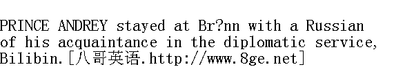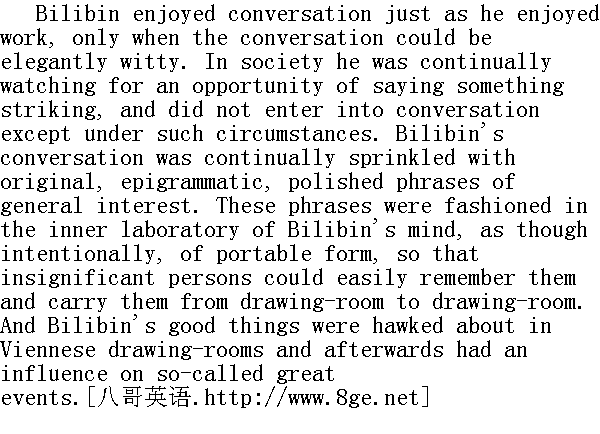 安德烈公爵在布吕恩的一个相识--俄国外交官比利宾那里住下来。 "Ah, my dear prince, there's no one I could have been more pleased to see," said Bilibin, coming to meet Prince Andrey. "Franz, take the prince's things to my bedroom," he said to the servant, who was ushering Bolkonsky in. "What, a messenger of victory? That's capital. I'm kept indoors ill, as you see."" 啊, 亲爱的公爵, 没有比看见您这位客人更令人高兴的事, "比利宾出去迎接安德烈公爵时说道。"弗朗茨, 把公爵的东西送到我的卧室中去!"他把脸转向伴随博尔孔斯基的仆人说, "怎么, 是报送胜利消息的人吗?好极了。您看, 我正害病哩。" After washing and dressing, Prince Andrey came into the diplomat's luxurious study and sat down to the dinner prepared for him. Bilibin was sitting quietly at the fireplace. 安德烈公爵盥洗、穿衣之后, 便走进外交官的豪华的书斋, 坐下来, 他面前摆着做好的午餐。比利宾安闲地坐在壁炉旁。 Not his journey only, but all the time he had spent with the army on the march, deprived of all the conveniences of cleanliness and the elegancies of life, made Prince Andrey feel now an agreeable sense of repose among the luxurious surroundings to which he had been accustomed from childhood. Moreover, after his Austrian reception, he was glad to speak-if not in Russian, for they talked French-at least to a Russian, who would, he imagined, share the general Russian dislike (which he felt particularly keenly just then) for the Austrians. 安德烈公爵不仅在旅行之后, 而且在他丧失一切舒适、洁净和优越的生活条件的行军之后, 他体会到自从童年时代以来他就在这个已经习惯的奢侈生活环境中休息时所体会的那种心旷神怡的感觉。除此而外, 他在受到奥国人的接待后, 能够和一个俄国人谈话, 即使不说俄国话(他们用法国话交谈), 也感到愉快;因为他认为这个交谈者也怀有俄国人对奥国人的共同的厌恶之感(现在特别强烈地被他体会到的厌恶之感)。 Bilibin was a man of five-and-thirty, a bachelor, of the same circle as Prince Andrey. They had been acquainted in Petersburg, but had become more intimate during Prince Andrey's last stay at Vienna with Kutuzov. Just as Prince Andrey was a young man, who promised to rise high in a military career, Bilibin promised to do even better in diplomacy. He was still a young man, but not a young diplomat, as he had been in the service since he was sixteen. He had been in Paris and in Copenhagen; and now in Vienna he filled a post of considerable importance. Both the foreign minister and our ambassador at Vienna knew him and valued him. He was not one of that great multitude of diplomats whose qualification is limited to the possession of negative qualities, who need simply avoid doing certain things and speak French in order to be very good diplomats. He was one of those diplomats who like work and understand it, and in spite of his natural indolence, he often spent nights at his writing-table. He worked equally well whatever the object of his work might be. He was interested not in the question "Why?" but in the question "How?" What constituted his diplomatic work, he did not mind, but to draw up a circular, a memorandum, or a report subtly, pointedly, and elegantly, was a task which gave him great pleasure. Apart from such labours, Bilibin's merits were esteemed the more from his ease in moving and talking in the higher spheres. 比利宾三十五岁左右, 未娶妻, 他和安德烈公爵属于同一个上流社会。他们早在彼得堡就已相识, 但在安德烈公爵随同库图佐夫抵达维也纳时, 他们的交往就更密切了。如果说, 安德烈公爵年轻, 并且在军事舞台会有远大前途, 那末比利宾在外交舞台的前途就更远大了。他还年轻, 而他已经不是年轻的外交官了, 因为他从十六岁那年起就开始任职, 曾经留驻巴黎、哥本哈根。目下在维也纳担任相当重要的职务。首相和我国驻维也纳大使都认识他, 而且重视他。他独树一帜, 不属于多数外交家之列, 他们为了要成为至为优秀的外交官员, 就需具备一些消极的优点, 不做某些不该做的事情, 而要会说一口法语。虽然有一些外交官秉性懒惰, 但是他们热爱工作, 而且善于工作, 他们有时候坐在办公桌旁一连熬上几个通宵, 比利宾属于这些外交官之列。无论工作的实质何在, 他都干得很出色。他所关注的不是"为什么要干"的问题, 而是"怎样干"的问题。外交上的事务是什么, 他满不在乎。他认为, 熟练地雅致而妥当地草拟通令、备忘录或报告才是他的莫大的乐趣。比利宾的功绩受到珍视, 除了笔头工作而外, 他还擅长在上层社会致词和交际。