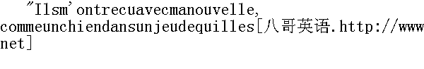 "①他说了一句收尾的话。 ①法语: 他们像对待跑进九柱戏场地的狗那样接待我这个报送消息的人。 Bilibin grinned, and the creases in his face disappeared. 比利宾苦笑一阵, 舒展开脸皮上的皱褶。 "All the same, my dear fellow," he said, gazing from a distance at his finger-nails, and wrinkling up the skin over his left eye, "notwithstanding my high esteem for the holy Russian armament, I own that your victory is not so remarkably victorious." "Cependant, moncher, " 他说道, 一面远远地察看自己的指甲, 一面皱起左眼以上的皮肤, "malgrelahauteestimequejepsofessepourle东正教的俄国战士们, j'avouequevotrevictoiren'estpasdesplusvictorieuses."② He went on talking in French, only uttering in Russian those words to which he wished to give a contemptuous intonation. 他用法国话继续说下去, 他想轻蔑地加以强调的那些词才用俄国话说出来。 "Why? with the whole mass of your army you fell upon the unlucky Mortier with one division, and Mortier slipped through your fingers? Where's the victory?"" 可不是?你们仗着全军人马猛烈地攻打只有一师人的很不幸的莫蒂埃, 这个莫蒂埃竟从你们手中逃跑了?哪能算什么胜利呢?" "Seriously speaking, though," answered Prince Andrey, "we can at least say without boasting that it's rather better than Ulm..."" 但是, 严格地说, "安德烈公爵答道, "我们还可以不吹牛地说, 这总比乌尔姆战役略胜一筹......" "Why didn't you capture us one, at least, one marshal?"" 你们为什么不给我们俘获一个元帅呢?即使是一个也行。"