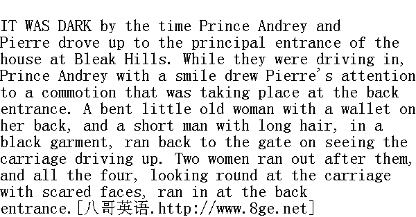 当安德烈公爵和皮埃尔驶近童山的住宅大门口的时候, 天渐渐黑了。他们快要驶近大门口, 安德烈公爵面露微笑, 要皮埃尔注意后面台阶附近发生的一阵混乱。有一个背着背囊的驼背的老太婆和一个身穿黑色衣裳、蓄着长发的身材不高的男人看见一辆驶进宅院的四轮马车, 急忙向后转, 往大门里跑。有两个女人跟在后面跑, 总共四个人都很惊恐地向后门台阶上跑, 一面回头望望四轮马车。 "Those are Masha's God's folk," said Prince Andrey. "They took us for my father. It's the one matter in which she does not obey him. He orders them to drive away these pilgrims, but she receives them."" 这是玛丽亚的神亲, "安德烈公爵说, "他们竟把我们之中的一人看作父亲了。这就是她不听从父亲的一件事情;他吩咐把朝圣者赶开, 可是她偏要接待他们。" "But what are God's folk?" asked Pierre." 什么叫做神亲呀?"皮埃尔问。 Prince Andrey had not time to answer him. The servants came out to meet them, and he inquired where the old prince was and whether they expected him home soon. The old prince was still in the town, and they were expecting him every minute. 安德烈公爵没有来得及回答。仆人们迎面走来, 他问他们老公爵在哪里, 是不是要等很久。老公爵还在城里, 他们每时每刻都在等候他。 Prince Andrey led Pierre away to his own suite of rooms, which were always in perfect readiness for him in his father's house, and went off himself to the nursery. 安德烈公爵把皮埃尔带到自己的卧室, 他在父亲住宅中的这屋子总是收拾得齐齐整整, 适宜于居住, 之后他亲自到儿童室去了。