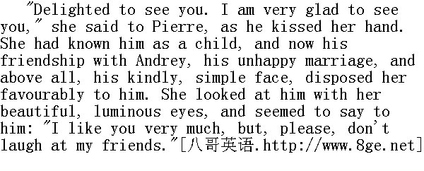 "Charmee de vous roir.Je suis tres contente de vous voir.③"当皮埃尔吻她的手的时候, 她对他说。 皮埃尔还是儿童的时候, 她就认识他, 而目前, 他和安德烈的交情, 他和妻子之间发生的不幸, 主要是, 他那和善的、显得朴实的面孔, 博得了她对他的好感。她用那十分美丽的、闪闪发亮的眼睛注视他, 仿佛对他说: "我非常爱您, 但是请您不要讥笑我的人。" ③法语: 看见您我非常高兴, 非常高兴。 After the first phrases of greeting, they sat down 他们寒暄了几句之后, 便坐下来了。 "Oh, and Ivanushka's here," said Prince Andrey with a smile, indicating the young pilgrim." 啊, 伊万努什卡也在这里。"安德烈公爵面露微笑地指着那个年轻的朝圣者说道。