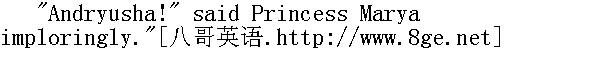 nom de Dieu!②"公爵小姐玛丽亚重复地说。 ②法语: 安德烈, 看在上帝份上。 It was plain that Prince Andrey's ironical tone to the pilgrims, and Princess Marya's helpless championship of them, were their habitual, long-established attitudes on the subject. 看来, 安德烈公爵对朝圣者的嘲弄态度和公爵小姐玛丽亚枉费心机的庇护, 是他们之间业已形成的、习以为常的相互关系。 "Why, my dear girl," said Prince Andrey, "you ought to be obliged to me, on the contrary, for explaining your intimacy with this young man to Pierre." "Mais, ma bonne amie, "安德烈公爵说, "Vous deAvriez au contraire m'etre reconnaissante de ce que j'explique a Pierre votre intimite avec ce jeune homme.③" "Indeed?" said Pierre, looking with curiosity and seriousness (for which Princess Marya felt particularly grateful to him) at the face of Ivanushka, who, seeing that he was the subject under discussion, looked at all of them with his crafty eyes. "Vraiment? ④"皮埃尔好奇而认真地说(公爵小姐玛丽亚为此而特别感激皮埃尔), 他透过眼镜很仔细地瞧着伊万努什卡的面孔, 伊万努什卡心里明白人们正在议论他, 就用狡黠的目光环顾着大家。 ④法语: 当真吗? Princess Marya had not the slightest need to feel embarrassment on her friends' account. They were quite at their ease. The old woman cast down her eyes, but stole sidelong glances at the new-comers, and turning her cup upside down in the saucer, and laying a nibbled lump of sugar beside it, sat calmly without stirring in her chair, waiting to be offered another cup. Ivanushka, sipping out of the saucer, peeped from under his brows with his sly, feminine eyes at the young men. 公爵小姐玛丽亚为她自己人而局促不安是毫无裨益的。他们一点也不羞怯。老太婆垂下眼帘, 斜视着进来的人, 她把茶碗翻过来, 扣在碟子上, 把吃剩的一块糖搁在碗旁边, 心情宁静地、一动不动地坐在安乐椅上, 等人家给她再斟一杯茶。伊万努什卡慢慢地饮着碟子里的茶, 一面皱起眉头, 把那调皮的女人眼睛打量几个年轻人。