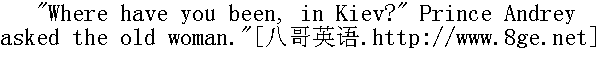 你到过哪里, 到过基辅吗?"安德烈公爵问老太婆。 "I have, good sir," answered the old woman, who was conversationally disposed; "just at the Holy Birth I was deemed worthy to be a partaker in holy, heavenly mysteries from the saints. And now, good sir, from Kolyazin a great blessing has been revealed."" 去过, 老爷子, "爱说话的老太婆回答, "圣诞节, 我在上帝的侍者中已获致神圣的上天的奥秘。老爷子, 甫才我自科利亚津来, 那里揭示了伟大的神赐......" "And Ivanushka was with you?"" 伊万努什卡和你同去的吧?" "I go alone by myself, benefactor," said Ivanushka, trying to speak in a bass voice. "It was only at Yuhnovo I joined Pelageyushka ..."" 施主, 我是独自去的, "伊万努什卡竭力地用男低音说, "在尤赫诺沃才和佩拉格尤什卡相遇了......" Pelageyushka interrupted her companion; she was evidently anxious to tell of what she had seen. "In Kolyazin, good sir, great is the blessing revealed." 佩拉格尤什卡打断伙友的话, 显然她很想把她目睹的情形讲给他听。"老爷子, 在科利亚津揭示了伟大的神赐。"