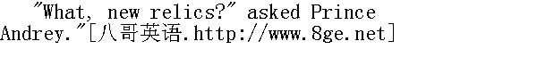 怎么, 又发现圣尸了吗?"安德烈公爵问。 "Hush, Andrey," said Princess Marya. "Don't tell us about it, Pelageyushka."" 安德烈, 够了, "公爵小姐玛丽亚说。"佩拉格尤什卡, 别讲下去了。" "Not ... nay, ma'am, why not tell him? I like him. He's a good gentleman, chosen of God, he's my benefactor; he gave me ten roubles, I remember. When I was in Kiev, Kiryusha, the crazy pilgrim, tells me-verily a man of God, winter and summer he goes barefoot-why are you not going to your right place, says he; go to Kolyazin, there a wonder-working ikon, a holy Mother of God has been revealed. On these words I said good-bye to the holy folk and off I went ..."" 不......怎么, 小姐, 为什么不能讲下去呢?我喜欢他。他这个行善的人, 上帝的宠儿, 给了我十个卢布, 我还记得。当我待在基辅的时候, 有个痴呆的基留沙对我说, 他是地道的神亲, 不论是冬天还是夏天, 总是光着脚步行。他说, 你所去的不是应该去的地方, 你去科利亚津吧, 那里有一座有灵的神像, 圣母在那里显圣了。我听了那些话, 就和这几个朝圣者告别, 于是到那里去了......" All were silent, only the pilgrim woman talked on in her measured voice, drawing her breath regularly. "I came, good sir, and folks say to me: a great blessing has been vouchsafed, drops of myrrh trickle from the cheeks of the Holy Mother of God ..." 大家都默不作声, 只有一个女朝圣者吸了一口气, 用那均匀的嗓音说话。"老爷子, 我到了那里, 人们告诉我: 发现了伟大的神赐, 圣油从圣母脸上往下滴......" "Come, that will do, that will do; you shall tell me later," said Princess Marya, flushing." 啊, 很好, 很好, 你以后再讲。"公爵小姐玛丽亚涨红着脸, 说。