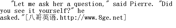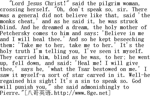 请让我来问问她, "皮埃尔说, "是你亲自看见的吗?"他问。 "To be sure, good sir, I myself was found worthy. Such a brightness overspread the face, like the light of heaven, and from the Holy Mother's cheeks drops like this and like this ..."" 老爷子, 可不是, 是我亲自受到神赐的。她那脸上的先轮就像上天之光, 灿烂辉煌, 圣油从圣母脸上不住地往下滴, 不住地往下滴......" "Why, but it must be a trick," said Pierre na?vely, after listening attentively to the old woman." 要知道这是一种欺骗。"皮埃尔天真地说, 又仔细听着朝圣者讲话。 "Oh, sir, what a thing to say!" said Pelageyushka with horror, turning to Princess Marya for support." 哎呀, 老爷子, 你说什么呀!"佩拉格尤什卡十分惊恐地说, 她把脸转向公爵小姐玛丽亚, 请求她庇护。 "They impose upon the people," he repeated." 他们在哄骗老百姓。"他重复地说一句话。