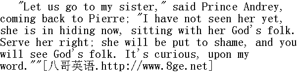我们到妹妹那里去吧。"安德烈公爵回到皮埃尔身边的时候, 这样说: "我还没有看见她, 她现在躲藏起来了, 她和几个神亲待在一起。她在我们面前觉得腼腆, 她活该, 你准能见到他们这几个神亲。C' est curieux, ma parole.①" ①法语: 真的, 这很有趣。 "What are 'God's folk'?" asked Pierre. "Qu'est ce que c'est que①神亲。"皮埃尔问。 ①法语: 什么是。