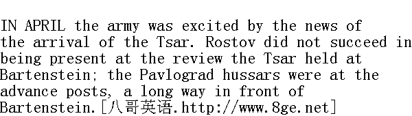 四月份, 国君驾临军中的喜讯使部队十分振奋。国君在巴滕施泰因举行阅兵式, 罗斯托夫未能出席;保罗格勒兵团驻扎在离前面的巴滕施泰因很远的前哨阵地。 They were bivouacking. Denisov and Rostov were living in a mud hut dug out by the soldiers for them, and roofed with branches and turf. The hut was made after a pattern that had just come into fashion among the soldiers. A trench was dug out an ell and a half in breadth, two ells in depth, and three and a half in length. At one end of the trench steps were scooped out, and these formed the entrance and the approach. The trench itself was the room, and in it the lucky officers, such as the captain, had a plank lying on piles at the further end away from the steps-this was the table. On both sides of the trench the earth had been thrown up, and these mounds made the two beds and the sofa. The roof was so constructed that one could stand upright in the middle, and on the beds it was possible to sit, if one moved up close to the table. Denisov, who always fared luxuriously, because the soldiers of his squadron were fond of him, had a board nailed up in the front part of the roof, and in the board a broken but cemented window pane. When it was very cold, they used to bring red-hot embers from the soldiers' camp-fires in a bent sheet of iron and set them near the steps (in the drawing-room, as Denisov called that part of the hut), and this made it so warm that the officers, of whom there were always a number with Denisov and Rostov, used to sit with nothing but their shirts on. 他们在宿营。杰尼索夫和罗斯托夫住在士兵替他们挖掘的土窑里, 土窑覆盖有树枝和草皮。土窑是采用当时合乎时尚的方法筑成的: 挖出一条沟--一俄尺半宽, 二俄尺深, 三俄尺半长。沟的一端做成梯蹬, 这就是斜坡和台阶, 沟本身就是一个房间: 幸运者(如同骑兵连连长)的房间里, 在那梯蹬对面的另一端, 有一块木板搁在几根木桩上, 这就是桌子。沿着沟的两边, 挖掉一立方俄尺的土, 这就是两张床和长沙发。土窑窑顶要做得那样高, 人在土窑中可以站起来, 如果把身子靠近桌子的一端, 甚至可以在床上坐起来, 杰尼索夫的日子过得挺阔气, 因为连里的士兵都喜爱他。窑顶的山墙是一块木板, 木板上面嵌有一块破了的、但却被粘起来的玻璃。当天气非常寒冷的时候, 人们从士兵的篝火中用弯弯的铁片舀取烧红的炭火放在梯蹬前面(杰尼索夫把土窑的这个部分称为接待室), 土窑里变得暖和起来了, 杰尼索夫和罗斯托夫身边经常有许多军官, 他们都觉得暖和, 只要穿一件衬衫坐在那儿就行了。 In April Rostov had been on duty. At eight o'clock in the morning, on coming home after a sleepless night, he sent for hot embers, changed his rain-soaked underclothes, said his prayers, drank some tea, warmed himself, put things tidy in his corner and on the table, and with a wind-beaten, heated face, and with only his shirt on, lay down on his back, folding his hands behind his head. He was engaged in agreeable meditations, reflecting that he would be sure to be promoted for the last reconnoitring expedition, and was expecting Denisov to come in. He wanted to talk to him. 四月间, 罗斯托夫值勤。早晨七点多种, 他熬过一个不眠之夜后走回来了, 吩咐把烧红的炭火拿来, 换下一套被雨淋湿的衣裳, 祈祷了上帝, 喝足了茶, 烤烤火取暖, 把他自己的角落和桌上的东西收拾得整整齐齐, 之后他就穿着一件衬衫, 仰卧下来, 把两只手放在脑袋下面, 露出一张风吹日晒变得粗糙的脸。他一边愉快地想到, 他因最近一次现地侦察有功, 将于几天之内晋升官阶, 一边等待着不知前往何地的杰尼索夫。罗斯托夫想和他谈谈。 Behind the hut he heard the resounding roar of Denisov, unmistakably irritated. Rostov moved to the window to see to whom he was speaking, and saw the quartermaster, Toptcheenko. 土窑外面可以听见杰尼索夫时断时续的叫喊声, 他显然在发脾气, 罗斯托夫移动脚步, 向窗口走去, 看看他和什么人打交道, 他看见骑兵连司务长托普琴科。 "I told you not to let them stuff themselves with that root-Mary's what do you call it!" Denisov was roaring. "Why, I saw it myself, Lazartchuk was pulling it up in the field."" 我已经命令你不让他们吃甜根, 叫什么玛莎甜根啊!"杰尼索夫喊道, "我亲眼看见拉扎丘克从田里把这种甜根抱来了。"