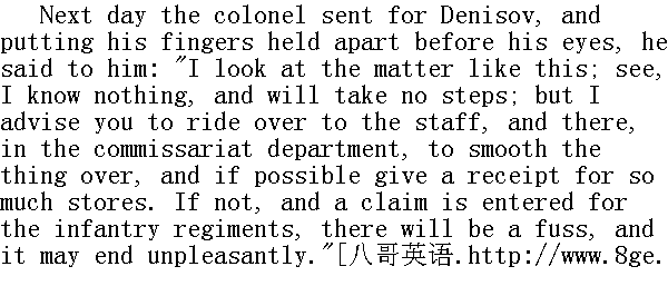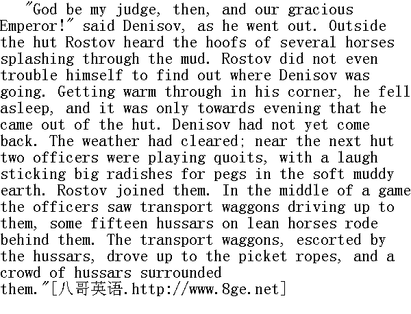 让上帝和国君审判我吧!"杰尼索夫走出土窑时说, 罗斯托夫听见土窑外面有几匹马在烂泥路上走着, 发出啪嗒啪嗒的响声。罗斯托夫甚至不想知道杰尼索夫骑马到何处去。他使他自己的角落变得暖和后, 便睡熟了, 到傍晚以前才起床, 走出了土窑。杰尼索夫还没有回来。黄昏时分天放晴。有两个军官和一名士官生在邻近的土窑旁边玩投钉游戏。他们哈哈大笑地把萝卜裁在疏松的泥地里。罗斯托夫也加入他们一伙了。玩到半中间的时候, 军官们看见几辆向他们驶来的大车, 莫约十五名骠骑兵骑着瘦马尾随于车后。由几名骠骑兵押送的大车驶近了系马桩, 一群骠骑兵把几辆大车围起来了。 "There, look! Denisov was always fretting about it," said Rostov; "here are provisions come at last."" 你看, 杰尼索夫还很悲哀, "罗斯托夫说, "军用食粮还是运来了。" "High time, too!" said the officers. "Won't the soldiers be pleased!"A little behind the hussars rode Denisov, accompanied by two infantry officers, with whom he was in conversation. Rostov went to meet them." 果然运到了!"军官们说, "士兵们可真高兴啊!"在骠骑兵后面不太远的地方, 杰尼索夫由两名步兵军官陪同, 骑着马走过来了, 杰尼索夫和他们谈论着什么事情。罗斯托夫向他迎面走来。 "I warn you, captain," one of the officers was saying, a thin, little man, visibly wrathful." 大尉, 我要向您提出警告。"一名军官说, 这个人身体消瘦, 个子矮小, 看样子, 是很愠怒的。 "Well, I have told you, I won't give them up," answered Denisov." 要知道我说了, 决不交出去。"杰尼索夫回答。