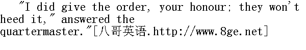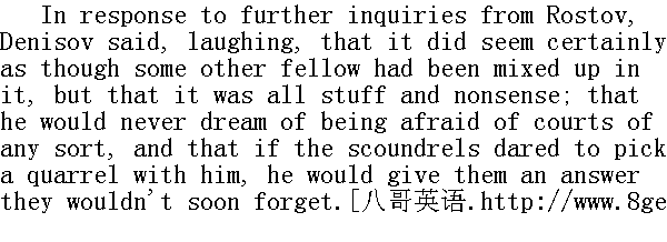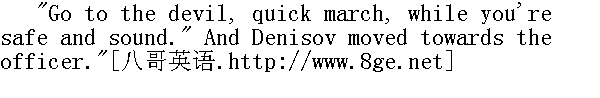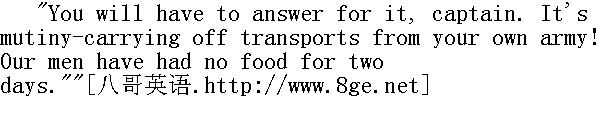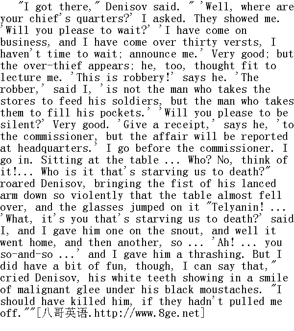 要由您负责, 大尉, 这是横行霸道--掠夺自己人的交能工具!我们的人有两天没有吃食物了。" "Mine have had nothing for a fortnight," answered Denisov." 而我的人有两个星期没有吃食物了。"杰尼索夫回答。 "It's brigandage; you will answer for it, sir!" repeated the infantry officer, raising his voice." 阁下, 这是抢劫行径, 您要负责的!"这个步兵军官提高嗓音重复地说。 "But why do you keep pestering me? Eh?" roared Denisov, suddenly getting furious. "It's I will have to answer for it, and not you; and you'd better not cry out till you're hurt. Be off!" he shouted at the officers." 可是您干嘛纠缠着我呢?啊?"杰尼索夫勃然大怒, 高声喊道, "是由我, 不是由您负责, 您不要在这里讨厌地叨叨, 还是好好的走开!"他对着那些军官喊道。 "All right!" the little officer responded, not the least intimidated, and not moving away. "It's robbery, so I tell you...."" 好啦!"那个身材矮小的军官不畏葸, 也不走开, 大声嚷道: "抢劫, 我叫您晓得......"