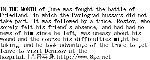 六月份, 弗里德兰爆发了一场战斗, 保罗格勒兵团没有参与这次战役, 紧接着宣布休战。罗斯托夫因为朋友不在身边而觉得难受, 自从他走后没有接到他的任何消息, 对他的案件的进程和伤势感到担心, 于是他就利用休战的机会请假到医院去探望杰尼索夫。 The hospital was in a little Prussian town, which had twice been sacked by Russian and French troops. In the summer weather, when the country looked so pleasant, this little town presented a strikingly melancholy contrast, with its broken roofs and fences, its foul streets and ragged inhabitants, and the sick and drunken soldiers wandering about it. 医院位于普鲁士的一个小镇, 这个小镇有两次遭到俄军和法军的摧毁。正因时值夏季, 田野里十分爽适, 而这个小镇上到处都是残垣断壁、毁坏的屋顶、污秽的街道、鹑衣百结的居民、流落于街头的醉醺醺的、病魔缠身的士兵, 这就构成了分外阴暗的景象。 The hospital was a stone house with remnants of fence torn up in the yard, and window frames and panes partly broken. Several soldiers bandaged up, and with pale and swollen faces, were walking or sitting in the sunshine in the yard. 医院里一栋砖石结构的房子, 庭院里可以看见拆掉的围墙的残迹, 门窗与玻璃部分地遭受摧毁。有几个绑着绷带、脸色惨白、遍身浮肿的士兵时而踱来踱去, 时而坐在庭院中晒晒太阳。 As soon as Rostov went in at the door, he was conscious of the stench of hospital and putrefying flesh all about him. On the stairs he met a Russian army doctor with a cigar in his mouth. He was followed by a Russian trained assistant. 罗斯托夫刚刚走进屋门, 就有一股腐烂的肉体和医院的气味向他袭来。他在楼梯上遇见一个叨着雪茄烟的俄国军医。俄国医士跟在他后面。 "I can't be everywhere at once," the doctor was saying; "come in the evening to Makar Alexyevitch's, I shall be there." The assistant asked some further question. "Oh! do as you think best! What difference will it make?"" 我不会分身似的同时抓许多事, "医生说道, "你晚上到马卡尔·阿列克谢耶维奇那里去, 我也到那里去。"医士还向他问了什么话。"咳!你知道怎么办, 就怎么办吧!岂不都是一样的吗?"