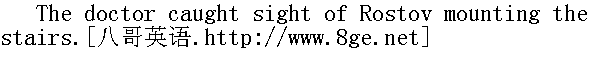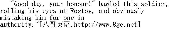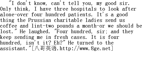 一言为定, 甭埋怨我吧。"医生从楼梯下面大声喊道。 Rostov and the assistant went into the corridor. The hospital stench was so strong in that dark corridor that Rostov held his nose, and was obliged to pause to recover his energy to go on. A door was opened on the right, and there limped out on crutches a thin yellow man with bare feet, and nothing on but his underlinen. Leaning against the doorpost, he gazed with glittering, anxious eyes at the persons approaching. Rostov glanced in at the door and saw that the sick and wounded were lying there on the floor, on straw and on overcoats. 罗斯托夫和医土走进了走廊。在这个昏暗的走廊里, 医院的气味十分浓, 以致罗斯托夫捂住自己的鼻子, 不得不停步, 好鼓足劲来往前走。右边的房门打开了, 一个面黄肌瘦的人拄着双拐杖、赤着脚、穿一套内衣从那里探出身子来。他依靠着门楣, 用妒嫉的、炯炯发亮的眼睛不时地望望从身旁走过去的人们。罗斯托夫朝门里一瞧, 瞧见了那些病号和伤员都躺在铺了一层干草和军大衣的地板上。 "Can one go in and look?" asked Rostov." 可以进去看看吗?"罗斯托夫问道。 "What is there to look at?" said the assistant. But just because the assistant was obviously disinclined to let him go in, Rostov went into the soldiers' ward. The stench, to which he had grown used a little in the corridor, was stronger here. Here the stench was different; it was more intense; and one could smell that it was from here that it came. In the long room, brightly lighted by the sun in the big window, lay the sick and wounded in two rows with their heads to the wall, leaving a passage down the middle. The greater number of them were unconscious, and took no notice of the entrance of outsiders. Those who were conscious got up or raised their thin, yellow faces, and all gazed intently at Rostov, with the same expression of hope of help, of reproach, and envy of another man's health. Rostov went into the middle of the room, glanced in at the open doors of adjoining rooms, and on both sides saw the same thing. He stood still, looking round him speechless. He had never expected to see anything like this. Just before him lay right across the empty space down the middle, on the bare floor, a sick man, probably a Cossack, for his hair was cut round in basin shape. This Cossack lay on his back, his huge arms and legs outstretched. His face was of a purple red, his eyes were quite sunk in his head so that only the whites could be seen, and on his legs and on his hands, which were still red, the veins stood out like cords. He was knocking his head against the floor, and he uttered some word and kept repeating it. Rostov listened to what he was saying, and distinguished the word he kept repeating. That word was "drink-drink-drink!" Rostov looked about for some one who could lay the sick man in his place and give him water." 究竟要看什么呀?"医士说。但是正因为医士显然不愿意让他走进病房, 罗斯托夫硬要走进士兵的病房。他已经闻惯了走廊里的气味, 这里的气味更浓。这里的气味稍微有点不同, 更令人觉得冲鼻子。可以敏锐地感到, 走廊的气味正是从这里发散出去的。太阳透过大窗户把长长的房间照得很明亮, 在这个房间里头, 病号和伤员把头靠着墙分成二排躺着, 房中间留了一条过道。他们大部分人昏迷不醒, 都没有注意走进来的人。那些神志清醒的人欠起身子, 或则抬起他们那消瘦的发黄的脸, 目不转睛地望着罗斯托夫, 个个都流露出同样的表情--指望帮助、责备和嫉妒他人的健康。罗斯托夫走到这个病房中间, 望望隔壁的房门口(几扇门都是敞开的), 他从房间的两边看见了同样的情景。他停步了, 默默不语地环顾四周。他决没有料到会目睹这种情状。就在他面前, 有一个病人横卧在过道中间的光地板上, 大概是个哥萨克, 剪了一个童化头。这个哥萨克伸开粗大的手脚, 仰卧着。他的脸色赤红, 两只眼睛往上翻, 只能看见眼白了, 他的赤脚上, 发红的手上, 一条条青筋像细绳似的绷得紧紧的。他的后脑勺碰了碰地板, 嗓音嘶哑地说了一句什么话, 又开始重复说出这句话。罗斯托夫仔细地听他说话, 听清了他重复说的这句话。这句话是: 喝点水, 喝水, 喝点水啊!罗斯托夫向四周环视, 想找人帮忙, 让这个病号躺好, 让他喝点水。 "Who looks after the patients here?" he asked the assistant. At that moment a commissariat soldier, a hospital orderly, came in from the adjoining room, and, marching in drill step, drew himself up before him." 谁在这里照顾病人呢?"他问医士。这时有个辎重兵, 医院的工友从隔壁房里走出来, 他退后一步, 直挺挺地站在罗斯托夫面前。