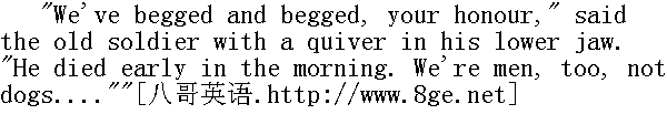大人, 我们请求过了, "老兵的下颏颤栗着说, "早上就有个人死了。要知道, 我们也是人, 而不是狗......" "I'll see to it directly; they shall take him, they shall take him away," said the assistant hurriedly. "Come, your honour."" 我马上派人把他抬走, 抬走, "医士连忙说, "大人, 我请您离开这里。" "Let us go, let us go," said Rostov hastily; and dropping his eyes and shrinking together, trying to pass unnoticed through the lines of those reproachful and envious eyes fastened upon him, he went out of the room." 我们走吧, 我们走吧。"罗斯托夫连忙说, 他垂下眼睛, 缩成一团, 极力不让人发现, 从这排向他凝视的、责备而嫉妒的目光中穿过去, 他走出这间屋子。