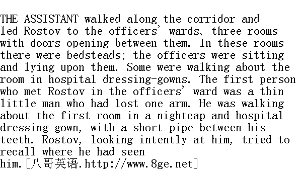 穿过走廊后, 医士把罗斯托夫领进军官病房, 病房有三个房间, 房门都是敞开的。在这些房间里摆着几张床铺, 负伤的和生病的军官在床上躺着或坐着。有几个人身穿病人服在房里踱来踱去。罗斯托夫在军官病房里遇见的头一个人是个身材矮小的瘦骨嶙峋的独臂的人, 他戴着睡帽、穿着病人服, 嘴角上叨着烟斗, 在第一间房里踱来踱去。罗斯托夫详察着他, 极力地想回忆起他在什么地方见过他。 "See where it was God's will for us to meet again," said the little man. "Tushin, Tushin, do you remember I brought you along after Sch?ngraben? They have sliced a bit off me, see,..." said he smiling, and showing the empty sleeve of his dressing-gown. "Is it Vassily Dmitryevitch Denisov you are looking for-a fellow-lodger here?" he said, hearing who it was Rostov wanted. "Here, here," and he led him into the next room, from which there came the sound of several men laughing. "How can they live in this place even, much less laugh?" thought Rostov, still aware of that corpse-like smell that had been so overpowering in the soldiers' ward, and still seeing around him those envious eyes following him on both sides, and the face of that young soldier with the sunken eyes." 没有料到在这儿遇见啦, "身材矮小的人说, "您还记得图申、图申是我把您领到申格拉本吗?您瞧, 砍掉了我这一小块......"他面露微笑, 把那只空空的袖筒拿给罗斯托夫看时这样说, "您是找瓦西里·德米特里耶维奇·杰尼索夫吗?--住在一起的人啊!"他知道罗斯托夫要找谁时说, "在这儿, 在这儿。"于是图申就把他领进另一间房里, 从房里传出几个人的哈哈大笑声。"他们怎么能够在这儿不仅哈哈大笑, 而且活得下去呢?"罗斯托夫想道, 他还闻到在士兵病院闻够了的尸体的气味, 他还从周围望见那两边伴送他的妒嫉的目光和这个痛苦得翻白眼的青年士兵的面孔。 Denisov, covered up to his head with the quilt, was still in bed, though it was twelve o'clock in the day. 虽然是上午十一点多钟, 但杰尼索夫还用被子蒙着头, 睡在床上。 "Ah, Rostov! How are you, how are you?" he shouted, still in the same voice as in the regiment. But Rostov noticed with grief, behind this habitual briskness and swagger, some new, sinister, smothered feeling that peeped out in the words and intonations and the expression of the face of Denisov." 啊, 罗斯托夫!你好, 你好!"他喊道, 那嗓音仍像平常他在兵团中说话时用的嗓音一样, 但罗斯托夫忧愁地觉察到, 他还怀有地所惯有的放肆而活跃的心态, 但是他的面部表情、语调和谈吐却流露出前所未有的、隐藏在内心深处的难堪的情感。 His wound, trifling as it was, had still not healed, though six weeks had passed since he was wounded. His face had the same swollen pallor as all the faces in the hospital. But that was not what struck Rostov: what struck him was that Denisov did not seem pleased to see him, and his smile was forced. Denisov asked him nothing either of the regiment or of the general progress of the war. When Rostov talked of it, Denisov did not listen. 尽管他负伤以后已经过了六个礼拜, 伤势并不太严重, 但是还没有愈合。他的脸苍白而且浮肿, 住军医院的伤病员都和他一样。但使罗斯托夫感到惊奇的不是这件事, 使他感到惊奇的是, 杰尼索夫看见他, 好像很不高兴, 对他流露出不自然的微笑。杰尼索夫既不询问兵团的情形, 也不询问战事的进程。当罗斯托夫谈论此事的时候, 杰尼索夫不听他说话。