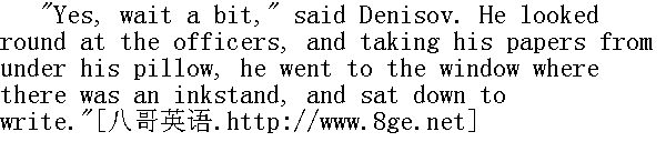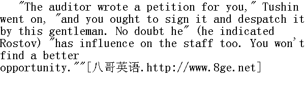 是啊, 请你等一下。"杰尼索夫朝着军官们瞥了一眼, 说道, 他从自己枕头下面拿出公文来, 走到那摆着他的墨水瓶的窗前, 坐下来写呈文。 "It seems it's no good knocking one's head against a stone wall," said he, coming from the window and giving Rostov a large envelope. It was the petition addressed to the Emperor that had been drawn up by the auditor. In it Denisov, making no reference to the shortcoming of the commissariat department, simply begged for mercy. "Give it, it seems..." He did not finish, and smiled a forced and sickly smile." 看来, 鞭子是打不断斧头背的。"他从窗前走开, 把一个大信封交给罗斯托夫时说道。这是检察官拟就的送呈国王的禀帖, 杰尼索夫在其禀帖中只字未提及军粮管理处的过失, 只是请求予以赦免。 "请你转交吧, 看来......"他没有把话说完, 病态地虚伪地微微一笑。