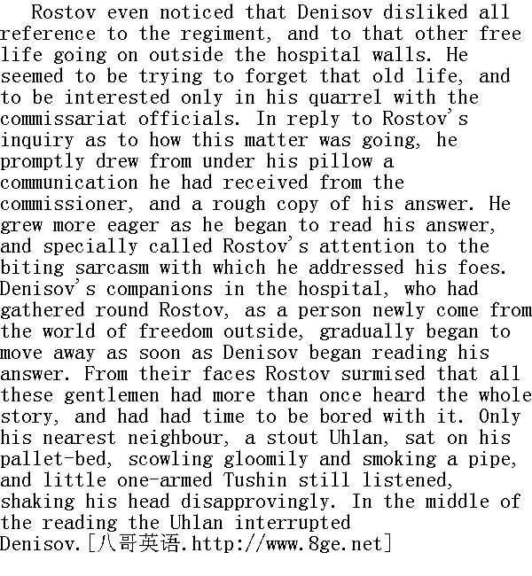 罗斯托夫甚至发现, 在向杰尼索夫提起兵团的情形, 总之是向他提起军医院以外的另一种自由生活的时候, 他就觉得很不高兴。他好像力图忘怀过去的生活, 只是关心他和军粮官的那个案子。为了回答罗斯托夫询及的案情, 他立即从枕头下面拿出一份他从委员会方面接到的公文和他草拟的答复。他变得兴奋起来, 开始念这份公文, 尤其是要罗斯托夫注意他在公文中对自己敌人说的这些讽刺的话。那些住院的杰尼索夫的伙伴, 原先把罗斯托夫--新近从自由世界走来的人物--围在中间, 但一当杰尼索夫开始念他的这份公文, 他们就渐渐走开。罗斯托夫凭他们的脸色心里就明白, 这些先生不止一次地听过使他们厌恶的整个故事。只有邻床的十分肥胖的枪骑兵阴郁地皱起眉头, 坐在自己的病床上抽烟斗, 身材矮小的独臂的图申继续听他讲故事, 不以为然地摇摇头, 念到半中间的时候, 枪骑兵打断杰尼索夫的话。 "What I say is," he said, turning to Rostov, "he ought simply to petition the Emperor for pardon. Just now, they say, there will be great rewards given and they will surely pardon."" 在我看来, "他把脸转向罗斯托夫说, "索性请求国王赦免。听说, 眼前颁发的奖赏更多, 大概能够得到饶恕的......" "Me petition the Emperor!" said Denisov in a voice into which he tried to throw his old energy and fire, but which sounded like the expression of impotent irritability. "What for? If I had been a robber, I'd beg for mercy; why, I'm being called up for trying to show up robbers. Let them try me, I'm not afraid of any one; I have served my Tsar and my country honestly, and I'm not a thief! And degrade me to the ranks and ... Listen, I tell them straight out, see, I write to them, 'If I had been a thief of government property...' "" 我要去请求国王!"杰尼索夫说, 他本想使他自己的嗓音赋有从前的激昂和劲头, 但是听来却是无益的急躁。"请求什么呢?如果我是个土匪, 我是会请求施恩的, 可是我受到审判是因为我揭露了一些土匪。让他们公审, 我不畏惧什么人;我诚实地为沙皇、为祖国效劳, 没有盗窃行为!竟把我革职......你听着, 我就直言不讳地禀奏, 我禀奏: 如果我是盗窃国库者......" "It's neatly put, no question about it," said Tushin. "But that's not the point, Vassily Dmitritch," he too turned to Rostov, "one must submit, and Vassily Dmitritch here won't do it. The auditor told you, you know, that it looks serious for you."" 写得真妙, 没有什么可说的, "图申说, "可是问题不在那里, 瓦西里, 德米特里奇, "他也对罗斯托夫说, "应当顺从, 您瞧, 瓦西里·德米特里奇不愿意。要知道, 检察官对您说过, 您的案情很糟糕。" "Well, let it be serious," said Denisov." 让它糟糕吧。"杰尼索夫说。