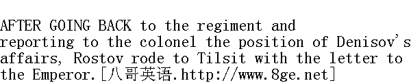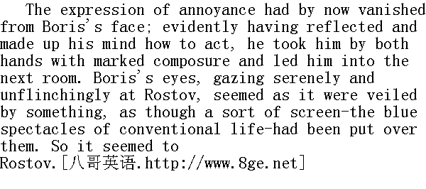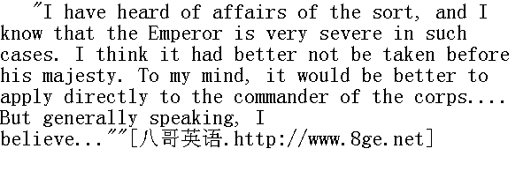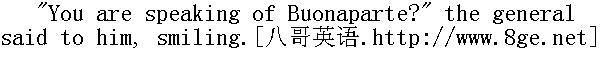 "Vous parlez de Buonaparte?"②那位将军面露微笑地对他说。 ②法语: 您说的是波拿巴吗? Boris looked inquiringly at his general, and immediately saw that this was a playful test. 鲍里斯疑惑地望望自己的将军, 他立刻明白, 这是一种幽默的刺探。 "I am speaking, prince, of the Emperor Napoleon," he replied. With a smile the general clapped him on the shoulder