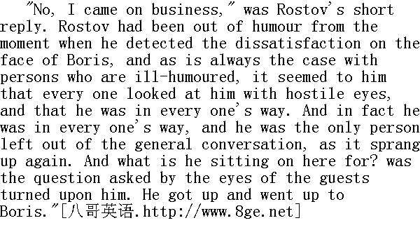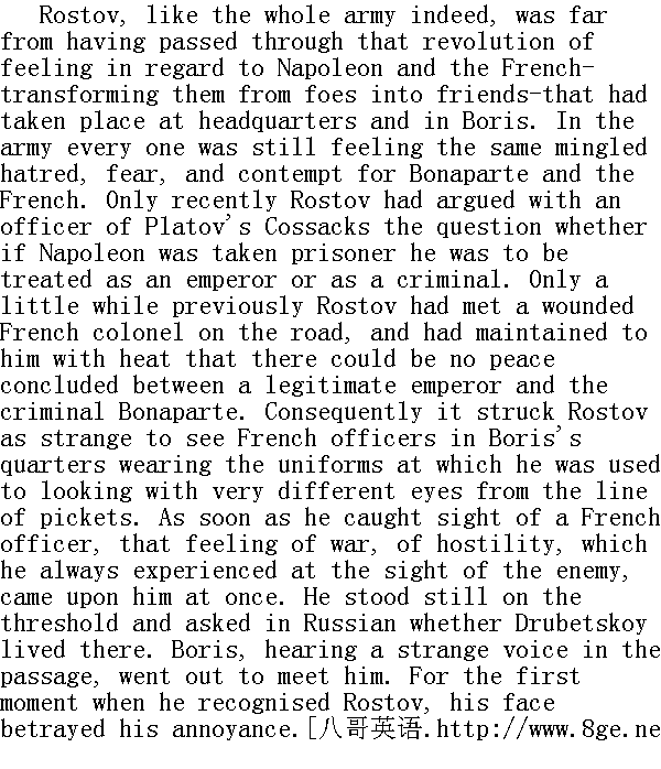 罗斯托夫如同整个军队(他是从军队中来的), 在对待由敌人转变成朋友的拿破仑和法国人的态度上, 还远未发生大本营和鲍里斯身上所发生的这种巨大变化。军队中仍能体验到仇视、轻蔑和畏惧波拿巴与法国人的掺杂在一起的情绪。还在不久前, 罗斯托夫和普拉托夫师的一名哥萨克军官谈话时, 这样争论: 如果拿破仑被俘, 他们不会把他看作国王, 而会把他看作罪人。不久以前罗斯托夫在途中遇见一名负伤的法国上校, 罗斯托夫急躁起来, 他向这名上校证明, 在合法的国王和罪犯波拿巴之间不可能有媾和之事。罗斯托夫习惯用迥异的眼光从侧翼防御散兵线上观看法国军官的军装, 因此鲍里斯住宅中的法国军官们的外貌竟使罗斯托夫感到惊讶。他一看见从门内探出身子的法国军官, 那种看见敌人时经常体验到的战斗的敌对情绪忽然把他控制住了。他在门坎上停步, 用俄国话问他, 德鲁别茨科伊是不是住在这里。鲍里斯在接待室听见陌生人的嗓音, 就走出去迎接他。当他乍见罗斯托夫时, 他脸上流露出懊恼的神情。 "Ah, that's you, very glad, very glad to see you," he said, however, smiling and moving towards him. But Rostov had detected his first impulse." 啊, 是你, 看见你我很高兴, 我很高兴。"他说, 不过面露微笑, 移动脚步, 向他走去。但是罗斯托夫发现了他最初的内心活动。 "I have come at a bad time, it seems," said he; "I shouldn't have come, but it's on a matter of importance," he said coldly...." 我好像来得不是时候, "他说道, "我原想不来, 可是我有桩事情。"他冷淡地说...... "No, I was only surprised at your getting away from the regiment. I will be with you in a moment," he said in reply to a voice calling him." 不, 我感到惊讶的只是, 你怎么从兵团走到这里来了, Dans un moment je suis a vous①。"他听见喊他的声音就转过头来回答。 "I see I have come at a bad time," repeated Rostov." 我知道, 我来得不是时候。"罗斯托夫重复地说。