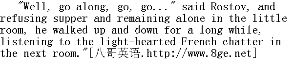喂, 走吧, 走吧, 走吧......"罗斯托夫说, 他拒绝了晚饭, 独自一人留在小房间里, 他在房间里踱来踱去, 踱了很久, 倾听隔壁房里法国人的快活的谈话声。