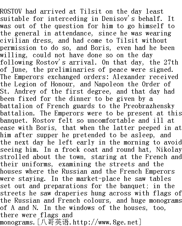 罗斯托夫在替杰尼索夫求情感到棘手的那天来到蒂尔西特。因为他穿着一身燕尾服, 未经上级允准擅自来到蒂尔西特, 所以他本人不能去见执勤的将军;鲍里斯即使愿意, 也不能在罗斯托夫抵达后次日办妥这件事, 六月二十七日之天, 签订了最初的和约条款。二位皇帝互换了勋章: 亚历山大获得荣誉团勋章, 拿破仑获得圣安德烈一级勋章, 是日法国近卫营为普列奥布拉任斯基营举办了一次宴会。两位国王均须出席这次盛大的宴会。 罗斯托夫和鲍里斯在一起时, 觉得不好意思, 很不舒服, 晚餐之后鲍里斯顺便来看他, 他假装睡着了, 第二天清早, 他尽力设法不和他见面, 离开了住宅。尼古拉穿着燕尾服, 戴着礼帽, 在城里徘徊游荡, 仔细地观看法国人和他们穿的制服, 仔细地观察街道和俄皇、法皇居住的楼房。他在广场上看见摆好的餐桌, 正准备饮宴。在街上他看见悬挂的帷幕和不同色彩的俄法两国国旗以及A(亚历山大的第一个字母)N(拿破仑的第一个字母)大型花字头。家家户户的窗子上也悬挂着两面国旗和花字。 "Boris doesn't care to help me, and I don't care to apply to him. That question's closed," thought Nikolay; "everything's over between us, but I'm not going away from here without having done all I can for Denisov, and, above all, getting the letter given to the Emperor. To the Emperor? ... He is here!" thought Rostov, who had unconsciously gone back to the house occupied by Alexander." 鲍里斯不愿帮助我, 我也不愿和他打交道。这个案子判决了, "尼古拉想道, "我们之间一切都已完结, 不过在没有办妥我能替杰尼索夫办到的事情之前, 主要是, 当我没有把呈文转交国王, 国王之前, 我万万不能从这儿走开!......他就在这儿!"正当罗斯托夫情不自禁地又向亚历山大占用的楼房走去时, 想道。 Saddle horses were standing at the entrance, and the suite were riding up, evidently getting ready for the Emperor to come out. 有几匹用以乘骑的马停在这栋楼房门口, 侍从们正在集合, 显然是为国王出巡作准备。 "Any minute I may see him," thought Rostov. "If only I could give him the letter directly, and tell him all ... could they really arrest me for my frock coat? Impossible. He would understand on which side the truth lay. He understands everything, he knows everything. Who can be juster and more magnanimous than he? Besides, even if they were to arrest me for being here, what would it matter?" he thought, looking at an officer who was going into the house. "Why, people go in, I see. Oh! it's all nonsense. I'll go and give the letter to the Emperor myself; so much the worse for Drubetskoy who has driven me to it." And all at once, with a decision he would never have expected of himself, Rostov, fingering the letter in his pocket, went straight into the house where the Emperor was staying." 我随时有可能看见他, "罗斯托夫想道, "我只要能把呈文直接转交给他, 说出全部情况就行了......难道仅为燕尾服一事就会把我逮捕吗?这没有可能!他会明白, 正义在谁一边。他什么都明白, 什么都知晓。究竟有谁比他更公允, 更宽宏大量呢?倘若因为我待在这里而把我逮捕起来, 那不算倒霉!"他一面想着, 一面望着那个走进国王占用的楼房的军官。"岂不是可以进去。哎, 全是废话。我走去把这份呈文亲自交给国王, 这样对德鲁别茨科伊更糟, 不过是他把我弄到这个地步的。"忽然罗斯托夫摸了摸口袋中的呈文, 出乎意料地毅然启步, 径直地向国王占用的楼房走过去。 "No, this time I won't miss my opportunity as I did after Austerlitz," he thought, expecting every minute to meet the Emperor, and feeling a rush of blood to the heart at the idea. "I will fall at his feet and will beseech him. He will lift me up, hear me out, and thank me too. 'I am happy when I can do good, but to cancel injustice is the greatest happiness,' " Rostov fancied the Emperor would say to him. And he passed up the stairs regardless of the inquisitive eyes that were turned upon him. The broad staircase led straight upwards from the entry; on the right was a closed door. Below, under the stairs, was a door to the rooms on the ground floor." 不, 我现在不能像在奥斯特科茨战役后那样放过这个好机会, "他想道, 时刻期待着遇见国王, 一出现这个念头, 他就觉得热血涌上心头。"我跪倒在国王脚下, 恳求他施恩, 他扶起我来, 听我直言, 还要感激我。""当我能够行善的时候, 我感到幸福, 能够纠正不公平的事情才是最大的幸福。"罗斯托夫脑海中想象到国王将要对他说出这番话。他于是从那些好奇地观望他的人身旁走过去, 登上国王临时占用的住宅的台阶。宽大的楼梯从门廊一直通到楼上, 右边可以看见一扇关上的门, 楼梯下面有一扇门, 通往楼房的底层。