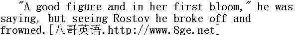 军官, 您是谁?" "A lieutenant, Count Rostov."" 中尉, 罗斯托夫伯爵。" "What audacity! Send it through the proper channel. And go along with you, go...." And he began putting on the uniform the valet handed him." 好大的胆子!要经由上级递来。您走吧, 走吧......"他开始穿上侍仆递给他的制服。 Rostov went out into the hall again, and noticed that by this time there were a great many officers and generals in full dress, and he had to pass through their midst. 罗斯托夫又走到外屋并且发现, 有许多军官和将军穿着整套阅兵服站在台阶下, 罗斯托夫应当从他们身边走去。 Cursing his temerity, ready to faint at the thought that he might any minute meet the Emperor and be put to shame before him and placed under arrest, fully aware by now of all the indecorum of his action, and regretting it, Rostov was making his way out of the house with downcast eyes, through the crowd of the gorgeously dressed suite, when a familiar voice called to him, and a hand detained him. 罗斯托夫责骂自己鲁莽, 当他想到随时有可能遇见国王, 在他面前丢脸, 还要给人逮捕起来的时候, 他就紧张得几乎要屏住气息, 他十分明白自己的行为很不光彩, 感到懊恼, 于是他垂下眼帘, 从这幢楼房中钻了出来, 一大群穿着华丽的侍从站在楼房的周围, 正在这时有一个熟人喊了他一声, 这个人的手把他拦了。