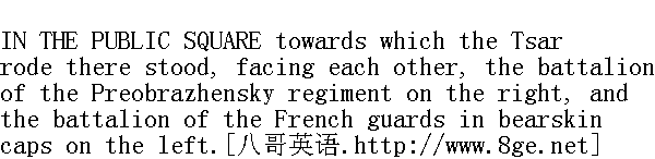 在国王奔驰而去的广场上, 右边有普列奥布拉任斯基兵团的一个营, 左边有戴着熊皮帽子的法国近卫军的一个营, 两营人面对面地伫立着。 While the Emperor was riding up to one flank of the battalions, who presented arms, another crowd of horsemen was galloping up to the opposite flank, and at the head of them Rostov recognised Napoleon. That figure could be no one else. He galloped up, wearing a little hat, the ribbon of St. Andrey across his shoulder, and a blue uniform open over a white vest. He was riding a grey Arab horse of extremely fine breed, with a crimson, gold-embroidered saddle-cloth. Riding up to Alexander, he raised his hat, and at that moment Rostov, with his cavalryman's eye, could not help noticing that Napoleon had a bad and uncertain seat on horseback. The battalions shouted hurrah, and vive l'Empereur! Napoleon said something to Alexander. Both Emperors dismounted from their horses and took each other by the hands. Napoleon's face wore an unpleasantly hypocritical smile. Alexander was saying something to him with a cordial expression. 在国王驰近举枪敬礼的两营官兵的一个侧翼时, 另一群骑士驰近对面的侧翼, 罗斯托夫认出了领头的是拿破仑。这不可能是任何其他人。他头上戴着小礼帽, 肩上横挎着安德烈勋章绶带, 身穿白色的无袖上衣, 外面罩着敞开扣子的蓝色制服, 骑着一匹不同于一般的阿拉伯良种灰马, 马鞍上垫着用金色丝线刺绣的绛红鞍韂, 他奔驰而来, 到了亚历山大面前, 微微地举起礼帽。罗斯托夫这个骑兵的眼睛一望见这个动作, 就不能不发觉, 拿破仑笨拙地、不平稳地骑行。两营官兵都高呼: "乌拉"和"Vive l'Empereur!"①拿破仑对亚历山大说了一句什么话。二位皇帝下了马、手牵手。拿破仑脸上流露出不悦意的佯装的微笑。亚历山大带着亲热的表情对他谈论着什么事。 ①法语: 皇帝万岁! In spite of the kicking of the horses of the French gendarmes, who were keeping back the crowd, Rostov watched every movement of the Emperor Alexander and of Bonaparte, and never took his eyes off them. What struck him as something unexpected and strange was that Alexander behaved as though Bonaparte were his equal, and that Bonaparte in his manner to the Russian Tsar seemed perfectly at ease, as though this equal and intimate relation with a monarch were something natural and customary with him. 虽然那些驱使人群后退的法国宪兵的马匹在肆意践踏, 但是罗斯托夫仍然目不转睛地注视亚历山大皇帝和波拿巴的每个动作。使他觉得惊奇的意外情形是, 亚历山大竟以平等地位对待波拿巴, 波拿巴也以平等地位对待俄国沙皇, 波拿巴感到毫无拘束, 他仿佛认为和国王接近是很自然的习以为常的事情。 Alexander and Napoleon, with a long tail of suite, moved towards the right flank of the Preobrazhensky battalion, close up to the crowd which was standing there. The crowd found itself unexpectedly so close to the Emperors, that Rostov, who stood in the front part of it, began to be afraid he might be recognised. 亚历山大、拿破仑和一长列跟随着他们的侍从走到了普列奥布拉任斯基营的右翼前面, 径直地向站在那儿的人群身边走去。忽然一群人不知不觉地在二位皇帝近旁出现了, 以致于站在这群人前排的罗斯托夫害怕有人会把他认出来。
