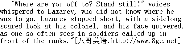 陛下, 请吩咐。" The Emperor frowned, with a look of displeasure, and, looking round, said: "Well, we must give him an answer." 国王不满地皱了皱眉头, 环顾四周后说道: "真要答复他呀。" Kozlovsky scanned the ranks with a resolute air, taking in Rostov too, in that glance. 科兹洛夫斯基神情坚定地环视自己的队伍, 连罗斯托夫也被囊括在他的视线中。 "Won't it be me!" thought Rostov." 真的在注意我吗?"罗斯托夫想了想。 "Lazarev!" the colonel called with a scowling face; and Lazarev, the soldier who was the best shot in firing at the range, stepped smartly forward." 拉扎列夫!"上校皱了皱眉头, 喊出了口令, 按高矮顺序排在第一的士兵拉扎列夫勇敢地向前走去。