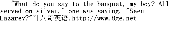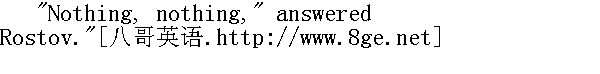 没有什么, 没有什么。"罗斯托夫答道。 "Are you coming in?"" 你顺路来一趟吗?" "Yes."" 嗯, 我会来的。" Rostov stood a long while in the corner, looking at the fete from a distance. His brain was seething in an agonising confusion, which he could not work out to any conclusion. Horrible doubts were stirring in his soul. He thought of Denisov with his changed expression, his submission, and all the hospital with torn-off legs and arms, with the filth and disease. So vividly he recalled that hospital smell of corpse that he looked round to ascertain where the stench came from. Then he thought of that self-satisfied Bonaparte, with his white hands-treated now with cordiality and respect by the Emperor Alexander. For what, then, had those legs and arms been torn off, those men been killed? Then he thought of Lazarev rewarded, and Denisov punished and unpardoned. He caught himself in such strange reflections that he was terrified at them. 罗斯托夫在屋角里站了很久, 从远外窥视参加盛宴的人们。他脑海中产生了无法忍受的痛苦, 他的心灵中出现了可怕的疑团。他时而回想杰尼索夫那种改变了的面部表情, 他的温顺的样子, 整个医院的气氛, 那些已被截除的手足, 污秽与疾病。他仿佛现在深深感觉到医院里的死尸的气味, 他环顾四周, 想要弄清楚这种气味是从哪里传来的。他时而回想这个沾沾自喜的波拿巴, 他那洁白的小手, 他如今正是亚历山大皇帝所喜爱和崇敬的皇帝。截断手和脚, 把人们打死, 这到底是为了什么呢?他时而回想获得奖赏的拉扎列夫和遭到惩罚的未受宽容的杰尼索夫。他常常发现自己产生这种古怪的念头, 以致于害怕起来。 Hunger and the savoury smell of the Preobrazhensky dinner roused him from this mood; he must get something to eat before going away. He went to an hotel which he had seen in the morning. In the hotel he found such a crowd of people, and of officers who had come, as he had, in civilian dress, that he had difficulty in getting dinner. Two officers of his own division joined him at table. The conversation naturally turned on the peace. The two officers, Rostov's comrades, like the greater part of the army, were not satisfied with the peace concluded after Friedland. They said that had they kept on a little longer it would have meant Napoleon's downfall; that his troops had neither provisions nor ammunition. Nikolay ate in silence and drank heavily. He finished two bottles of wine by himself. The inward ferment working within him still fretted him, and found no solution. He dreaded giving himself up to his thoughts, and could not get away from them. All of a sudden, on one of the officers saying that it was humiliating to look at the French, Rostov began shouting with a violence that was quite unprovoked, and consequently greatly astounded the officers. 普列奥布拉任斯基营官兵们吃的食物的香气和罗斯托夫的饥饿, 把他从这种停滞状态中唤醒过来, 应当在动身之前吃点东西。他到早晨他看见的那家饭店去了。在饭店里他碰见许多老百姓和军官, 他们也和他一样, 穿着便服来到了本地, 他好不容易才弄到一顿午饭。两个和他同在一个师部服务的军官跟他结伴了。不消说, 话题涉及到和平。军官们, 即是罗斯托夫的同志们, 正如军队中的大多数人, 都不满意弗里德兰战役后缔结的和平。据说, 拿破仑再坚持一些时日, 就要完蛋的, 他的部队中既没有面包, 也没有弹药。尼古拉不吭一声地吃着, 主要是喝酒。他一个人就喝了两瓶酒, 他内心出现的痛苦的心事没有化除, 总是没完没了地使他难受。他害怕沉沦于自己的思想, 可是又不能把它摒弃。忽然有一名军官说, 一看见法国官兵就令人难受, 罗斯托夫听见这些话毫无缘由地、急躁地喊叫起来, 使两名军官大为惊讶。