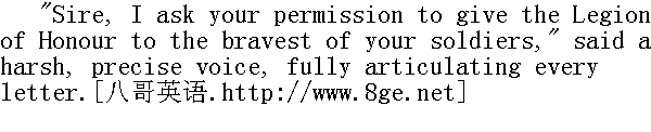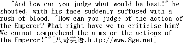 "Sire, je vous demande la permission de donAner la legion d′honneur au plus brave de vos soldats."②一个具有刺耳的尖细嗓音的人开腔了, 把个个字母全都说出来了。 ②法语: 国王, 请让我把荣誉团勋章发给您的最勇敢的士兵。 It was little Bonaparte speaking, looking up straight into Alexander's eyes. Alexander listened attentively to what was said to him, and bending his head smiled amiably. 身材矮小的波拿巴说了这席话, 他从下向上直勾勾地盯着亚历山大的眼睛。亚历山大用心地听他说话, 低下头, 快活地微微一笑。 "To him who bore himself most valiantly in this last war," added Napoleon, emphasising each syllable, and with an assurance and composure, revolting to Rostov, scanning the rows of Russian soldiers drawn up before him, all presenting arms, and all gazing immovably at the face of their own Emperor. ①法语: 发给在这次战争中表现得最勇敢的人。 "Will your majesty allow me to ask the opinion of the colonel?" said Alexander, and he took a few hurried steps towards Prince Kozlovsky, the commander of the battalion. Bonaparte was meanwhile taking the glove off his little white hand, and, tearing it, he threw it away. An adjutant, rushing hurriedly forward from behind, picked it up. "Give it to whom?" the Emperor Alexander asked of Kozlovsky in Russian, in a low voice. "Votre majeste me permettra-t-elle de deAmander l'avis du colonel?"②亚历山大说, 并向营长科兹洛夫斯基公爵急促地迈出几步。与此同时, 波拿巴从洁白的小手上取下一只手套, 把它撕破, 抛在地上。一名副官急忙地向前奔去, 把它拣起来。 "发给什么人?"亚历山大皇帝用俄语低声地问科兹洛夫斯基。 ②法语: 陛下, 请允许我问问上校的意见, 好吗?