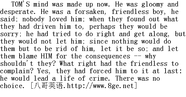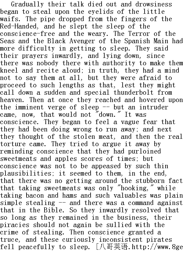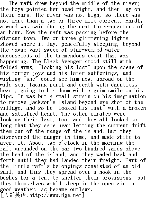 汤姆现在横下了一条心。他又忧郁又绝望。他说自个儿成了无亲无友、被人抛弃的孩子,没谁爱他。也许,等那些人发觉把地逼到这般田地时,他们会内疚的。他一直努力着以便不出差错,好好向上,但人们偏偏又不让他那样;既然他们一心要避开他,那就悉听尊便吧;就让他们为了将要发生的事来责怪他好了--他们就这德性,随他们去!话再说回来了,像他这样一个无亲无故的人哪有资格责怪人家呢?是的,是他们逼他铤而走险的:他要过犯罪的营生,别无选择。 By this time he was far down Meadow Lane, and the bell for school to "take up" tinkled faintly upon his ear. He sobbed, now, to think he should never, never hear that old familiar sound any more -- it was very hard, but it was forced on him; since he was driven out into the cold world, he must submit -- but he forgave them. Then the sobs came thick and fast. Just at this point he met his soul's sworn comrade, Joe Harper -- hard-eyed, and with evidently a great and dismal purpose in his heart. Plainly here were "two souls with but a single thought." Tom, wiping his eyes with his sleeve, began to blubber out something about a resolution to escape from hard usage and lack of sympathy at home by roaming abroad into the great world never to return; and ended by hoping that Joe would not forget him. 此刻他已快走到草坪巷的尽头,学校的上课铃声隐隐在耳边震响。一想到自己将永远、永远也听不到这熟悉的声音,他禁不住啜泣起来--残酷的事实怎能不令人难受呢,可这是人家逼的呀。既然他们存心要把他投进冰窟,他只有认命的份--但他原谅了他们。想到这里,他哭得更伤心了。 恰在此时,他遇到了他的铁哥们儿乔·哈帕--他两眼发直,显然心怀鬼胎。不消说,他俩正是"一条道儿上"的朋友。汤姆用袖子擦了擦眼睛,边哭边说自己决意要离开这非人生活的鬼学校和没有同情心的家人,浪迹天涯,一去不回。最后他说希望乔别忘了他。 But it transpired that this was a request which Joe had just been going to make of Tom, and had come to hunt him up for that purpose. His mother had whipped him for drinking some cream which he had never tasted and knew nothing about; it was plain that she was tired of him and wished him to go; if she felt that way, there was nothing for him to do but succumb; he hoped she would be happy, and never regret having driven her poor boy out into the unfeeling world to suffer and die. 可巧,乔原来也正是特地赶来向汤姆告别,向他提出这样的请求的。他妈妈因为他偷喝奶酪揍了他一顿,其实他压根儿没喝,尝都没尝过,根本不知道那回事。明摆着的,她讨厌他了,巴望他走开。既然她这么想,他除了顺从,还能怎么样呢?但愿她能开开心,永远不会后悔是自己把可怜的儿子赶出家门,让他置身冷酷的世界,去受罪,去死。 As the two boys walked sorrowing along, they made a new compact to stand by each other and be brothers and never separate till death relieved them of their troubles. Then they began to lay their plans. Joe was for being a hermit, and living on crusts in a remote cave, and dying, some time, of cold and want and grief; but after listening to Tom, he conceded that there were some conspicuous advantages about a life of crime, and so he consented to be a pirate. 两个孩子一边伤心地赶路,一边订立了一个新盟约,发誓互帮互助,情同手足,永不离分,除非死神硬要来拆散他们,让他们获得彻底的解脱。接着,他们就开始拟订行动计划。乔提议去当隐士,远离人群,穴居野外,靠干面包维生,等着终于有那么一天被冻死、饿死、伤心而死。不过,听罢汤姆一席话后,他也认为干犯罪的勾当并不赖,于是欣然同意去当海盗。 Three miles below St. Petersburg, at a point where the Mississippi River was a trifle over a mile wide, there was a long, narrow, wooded island, with a shallow bar at the head of it, and this offered well as a rendezvous. It was not inhabited; it lay far over toward the further shore, abreast a dense and almost wholly unpeopled forest. So Jackson's Island was chosen. Who were to be the subjects of their piracies was a matter that did not occur to them. Then they hunted up Huckleberry Finn, and he joined them promptly, for all careers were one to him; he was indifferent. They presently separated to meet at a lonely spot on the river-bank two miles above the village at the favorite hour -- which was midnight. There was a small log raft there which they meant to capture. Each would bring hooks and lines, and such provision as he could steal in the most dark and mysterious way -- as became outlaws. And before the afternoon was done, they had all managed to enjoy the sweet glory of spreading the fact that pretty soon the town would "hear something." All who got this vague hint were cautioned to "be mum and wait." 在圣彼得堡镇下游三英里的地方,密西西比河宽约一英里多,那儿有个狭长的、林木丛生的小岛。岛前有块很浅的沙滩,这地方是块秘密碰头的风水宝地。岛上荒无人烟,离对岸很近,紧挨着河岸还有片茂林,人迹罕至。于是他们相中了这个杰克逊岛。至于当海盗后,该打劫谁,他们倒一点也没动脑子。接着,他们找到了哈克贝利·费恩,他马上就入了伙,因为对他来说,随遇而安惯了,他反正是无所谓。不久,他们便分了手,约好在他们最喜欢的时刻--半夜,在镇子上游两英里远的河岸上一个僻静处碰头。那儿有只小木筏,他们打算据为己有。每个人都要带上钓鱼的钩子和线,以及各自用秘密招术--也就是照强盗们那样子偷来物什,并以此来装备自己。天刚擦黑,他们就已经在镇子里扬出话来,说人们很快就将"听到重大新闻",如此这般以后,他