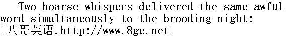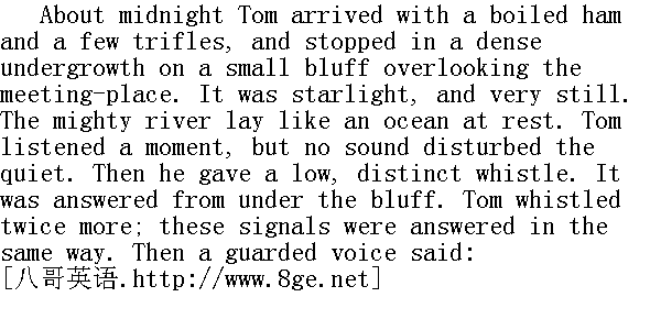 夜半光景,汤姆带着一只熟火腿和几件小东西赶来了。他站在一个小悬崖上的一片又密又矮的树林里。从悬崖往下望就能瞧见他们约好的碰头处。这是个星光灿烂的夜晚,四周一片寂静。宽阔的河流海洋般静卧着。汤姆侧耳听了会儿,没有什么声音来搅扰这一片宁静。于是他就吹了声口哨,声音虽然低,可却清晰可辨。悬崖下立即有人回应。汤姆又吹了两声,也得到了同样的回应。然后他听到一个警惕的声音问: "Who goes there?" " 来者何人?" "Tom Sawyer, the Black Avenger of the Spanish Main. Name your names." " 我乃西班牙海黑衣侠盗,汤姆·索亚。尔等何人?" "Huck Finn the Red-Handed, and Joe Harper the Terror of the Seas." Tom had furnished these titles, from his favorite literature. " 赤手大盗哈克·费恩,海上死神乔·哈帕。" 这两个头衔是汤姆从他最爱看的书里,挑出来封给他俩的。 "'Tis well. Give the countersign." " 好,口令?"