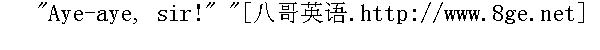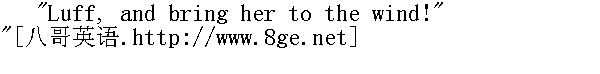 是--是,船长!" "Shake out that maintogalans'l! Sheets and braces! NOW my hearties!" " 拉起第二接桅帆!拉起脚索,转帆索!喂,伙计们!" "Aye-aye, sir!" " 是--是,船长!" "Hellum-a-lee -- hard a port! Stand by to meet her when she comes! Port, port! Now, men! With a will! Stead-y-y-y!" " 要起大风了--左转舵!风一来就顺风开!左转,左转! 伙计们,加把油!照直--走!" "Steady it is, sir!" " 是,照直走,船长!"