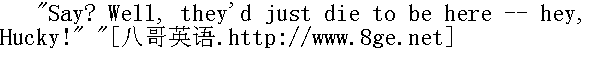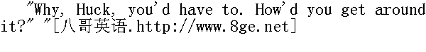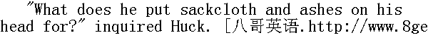 哈克问:"他们头上缠粗麻布、抹着灰干嘛?" "I dono. But they've GOT to do it. Hermits always do. You'd have to do that if you was a hermit." " 我不清楚。不过他们非这么做不可。隐士就得这样。你要是隐士,你也得这么做。" "Dern'd if I would," said Huck. " 我才不干呢,"哈克说。 "Well, what would you do?" " 那你怎么干?" "I dono. But I wouldn't do that." " 我不知道,反正我不干。"