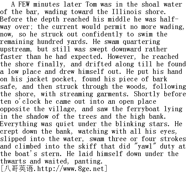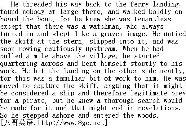 他转弯抹角,回到了渡船码头,发现那里没人走动,就大胆地上了船。他知道船上只有一个守船的人,没别的人,而他总是睡觉,睡起觉来像个雕像一样。他解开船尾的小艇,悄悄跳上去,很快就小心翼翼地向上游划去。他划离了村子有一英哩时,调转船头,全力以赴,冲着对岸径直划过去。他很娴熟地就靠上了岸,这对他来说只是雕虫小技而已。他很想把这只小船据为己有,理由是完全可以把它当作一艘大船,因此而被海盗掳获,正在情理之中。但他转念一想,丢了这只艇,人家一定会四处搜寻,这样反而会将事情败露,所以他就弃舟登岸,钻进了树林。 He sat down and took a long rest, torturing himself meanwhile to keep awake, and then started warily down the home-stretch. The night was far spent. It was broad daylight before he found himself fairly abreast the island bar. He rested again until the sun was well up and gilding the great river with its splendor, and then he plunged into the stream. A little later he paused, dripping, upon the threshold of the camp, and heard Joe say: 他坐下来,歇了好一阵子,同时拼命克制住睡意,然后又小心谨慎地向露营地所在的河湾走去。此时一夜将尽。当他走到岛上的沙滩时,天已大亮。他又歇了一歇,直到日上三竿,光芒四射,宽阔的河面上金波雀跃,他又往河里纵身一跳。一小会儿之后,他浑身水淋淋地站在宿营地的门口,听见乔说: "No, Tom's true-blue, Huck, and he'll come back. He won't desert. He knows that would be a disgrace to a pirate, and Tom's too proud for that sort of thing. He's up to something or other. Now I wonder what?" " 不会的,汤姆是最守信用的,哈克,他会回来。他不会抛弃我们。他知道这样做对一个海盗来说是不体面的,像汤姆这样爱面子的人,是不会干出这种事情的。他一定是有事出去了。不过,他究竟干什么去了呢?" "Well, the things is ours, anyway, ain't they?" " 哎,不管怎么说,这些玩意儿归我们了,对不对?" Pretty near, but not yet, Huck. The writing says they are if he ain't back here to breakfast." " 差不多吧,不过还不能肯定,哈克。他条子上说,如果吃早饭时,他还没回到这儿来,这些东西就归我们了。"