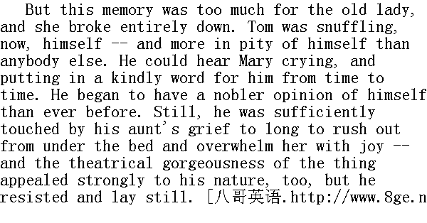 老太太说着说着,伤心得实在说不下去了,她一下子放声哭起来。此时的汤姆鼻子也发起酸来--这倒不是他在同情别人,而是在可怜自己。他听见玛丽也在哭,还时不时为他说上一两句好话。他从没有像现在这样感到自己是个不平凡的人。还有,姨妈伤心的样子深深地打动汤姆,他真想从床下面冲出来,让她惊喜欲狂--再说汤姆也十分喜欢制造些富于戏剧性的场景,但这一次他却沉住气,没有动弹。 He went on listening, and gathered by odds and ends that it was conjectured at first that the boys had got drowned while taking a swim; then the small raft had been missed; next, certain boys said the missing lads had promised that the village should "hear something" soon; the wise-heads had "put this and that together" and decided that the lads had gone off on that raft and would turn up at the next town below, presently; but toward noon the raft had been found, lodged against the Missouri shore some five or six miles below the village -- and then hope perished; they must be drowned, else hunger would have driven them home by nightfall if not sooner. It was believed that the search for the bodies had been a fruitless effort merely because the drowning must have occurred in mid-channel, since the boys, being good swimmers, would otherwise have escaped to shore. This was Wednesday night. If the bodies continued missing until Sunday, all hope would be given over, and the funerals would be preached on that morning. Tom shuddered. 他继续听着,从零零星星的谈话中得知,开头人们以为几个孩子在游泳中淹死了;其后他们又发现那只小木筏不见了;接着又有些孩子说这几个失踪的孩子曾暗示过镇上人不久将"听到重大新闻";那些有头脑的聪明人根据东拼西凑的消息断定几个小家伙一定是撑着小木筏出去了,不久就会在下游的村镇里出现;但是时近中午,人们发现木筏停在镇子下游五六英里的密西西比河岸边--可孩子们不在上边,于是希望成了泡影,破灭了;他们准是淹死了,否则的话,不要到天黑,他们就会饿得往家来。大家认为打捞尸体是徒劳无获的,因为几个孩子一定是在河当中淹死的,要不然,凭他们那么好的水性,早就凫到岸上来了。今天是星期三晚上。要是到星期天还找不着尸体的话,那什么希望都没有了,星期天早上就举行丧礼。汤姆听到这里,浑身一阵簌簌乱抖。 Mrs. Harper gave a sobbing good-night and turned to go. Then with a mutual impulse the two bereaved women flung themselves into each other's arms and had a good, consoling cry, and then parted. Aunt Polly was tender far beyond her wont, in her good-night to Sid and Mary. Sid snuffled a bit and Mary went off crying with all her heart. 哈帕太太带着哭腔道了声晚安就要走。这两个失去亲人的女人忽然一阵激动,抱在一起痛痛快快地哭了一场后,这才分手。波莉姨妈在与希德和玛丽道别时,一反惯例,显得万分温柔。希德有点抽鼻子,玛丽却是大哭着走的。 Aunt Polly knelt down and prayed for Tom so touchingly, so appealingly, and with such measureless love in her words and her old trembling voice, that he was weltering in tears again, long before she was through. 波莉姨妈跪下来,为汤姆祈祷。她祈祷得如怨如泣,令人感动。汤姆见她老人家声音颤抖,话里充满无限爱意,还没有等她说完他已是以泪洗面了。 He had to keep still long after she went to bed, for she kept making broken-hearted ejaculations from time to time, tossing unrestfully, and turning over. But at last she was still, only moaning a little in her sleep. Now the boy stole out, rose gradually by the bedside, shaded the candle-light with his hand, and stood regarding her. His heart was full of pity for her. He took out his sycamore scroll and placed it by the candle. But something occurred to him, and he lingered considering. His face lighted with a happy solution of his thought; he put the bark hastily in his pocket. Then he bent over and kissed the faded lips, and straightway made his stealthy exit, latching the door behind him. 波莉姨妈上床以后很久,因为她很伤心,不时地发出长吁短叹,睡思不宁,辗转反侧,久不成眠。但到后来,她还是安静地睡了,只不过偶尔还能听到一两声的呻吟声。于是汤姆便从床底下钻出来,慢慢地站起,用手挡住烛光,立在床边端详着她。心里对她充满了怜悯。他从口袋里捣出梧桐树皮,放在蜡烛旁边。可是他忽然想起了什么事,犹豫了一下。他作出了一个愉快的决定,脸上露出了喜色;他赶忙把树皮放到口袋里。接着他弯下腰来,吻了吻那憔悴的嘴唇,就悄悄地径直向门口走去,走时还把门给闩好了。