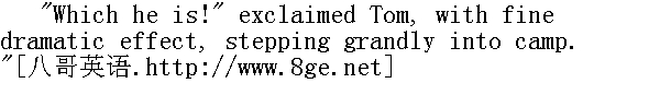 说曹操,曹操到!"汤姆喊了一声,像演戏一样,神气十足地大步流星走了进来。 A sumptuous breakfast of bacon and fish was shortly provided, and as the boys set to work upon it, Tom recounted (and adorned) his adventures. They were a vain and boastful company of heroes when the tale was done. Then Tom hid himself away in a shady nook to sleep till noon, and the other pirates got ready to fish and explore. 不久,一顿丰盛的咸肉加鲜鱼的早餐便端了上来,孩子们围坐着,一边大口大口吃早饭,汤姆一边讲述了他回家的经历,还不忘添油加醋。汤姆讲罢,他们成了一群虚荣心强、自命不凡的英雄。然后汤姆就躲到一个阴凉幽静的地方去睡觉,一直睡到中午。其余两个海盗,忙着为钓鱼和探险做准备。