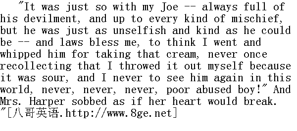 我的乔也正是这样--调皮捣蛋,凡是淘气的事,他都占上。可他不自私,心眼好。天哪!想起揍他的事,我就难过。我以为他偷吃了奶酪,不分青红皂白地拿鞭子抽了他一顿,压根没想到是奶酪酸了,我亲手倒掉的。好了,这下子,我别想活着见到他了,永远、永远、永远也见不着了。这个可怜的、受尽虐待的孩子啊!"接着哈帕太太似乎伤心至极,哽咽着,泣不成声。 "I hope Tom's better off where he is," said Sid, "but if he'd been better in some ways --" " 我希望汤姆现在活得很快活,"希德说,"不过他以前有些事干得不怎么样……" "Sid!" Tom felt the glare of the old lady's eye, though he could not see it. "Not a word against my Tom, now that he's gone! God'll take care of him -- never you trouble yourself, sir! Oh, Mrs. Harper, I don't know how to give him up! I don't know how to give him up! He was such a comfort to me, although he tormented my old heart out of me, 'most." " 希德!"汤姆尽管看不清,但却感觉到老太太是瞪着眼睛在跟希德讲话。"汤姆已经走了,不许你再说他一句坏话!有老天爷照顾他--用不着您来操心,我的先生!哦,哈帕太太,我简直不知道怎样才能忘掉他!我简直不知道怎样才能忘掉他!虽然他从前常折磨我这颗衰老的心,但他毕竟也给了我极大的安慰啊。" "The Lord giveth and the Lord hath taken away -- Blessed be the name of the Lord! But it's so hard -- Oh, it's so hard! Only last Saturday my Joe busted a firecracker right under my nose and I knocked him sprawling. Little did I know then, how soon -- Oh, if it was to do over again I'd hug him and bless him for it."" 上帝把他们赐给我们,又把他们收回去了,--感谢上帝!可这太残酷了--啊,实在让人受不了!就在上星期六,我的乔在我面前放了个炮竹,我就把他打趴在地上。谁知道这么快他就……啊,要是一切能从头再来一次,我一定会搂着他,夸他干得好。" "Yes, yes, yes, I know just how you feel, Mrs. Harper, I know just exactly how you feel. No longer ago than yesterday noon, my Tom took and filled the cat full of Pain-killer, and I did think the cretur would tear the house down. And God forgive me, I cracked Tom's head with my thimble, poor boy, poor dead boy. But he's out of all his troubles now. And the last words I ever heard him say was to reproach --" " 是啊,是啊,是啊,我理解你的心情,哈帕太太,我完全理解。就在昨天中午,我的汤姆逮住猫给它灌了很多止痛药,当时我认为这下子它会把家给毁掉。真是对不起老天爷,我拿顶针敲了汤姆的头,可怜的孩子,我那可怜的短命的孩子啊。不过,现在他总算从万般烦恼中解脱出来。我最后听见他说的话就是责备我……"