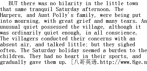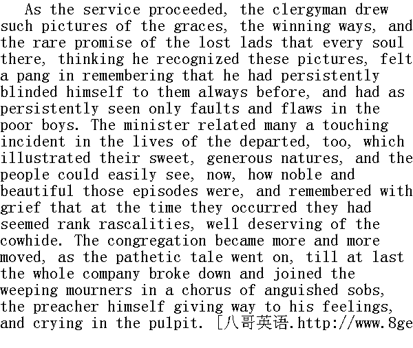 想到这里,她再也支撑不住了。于是她茫然走开,泪水顺着脸颊往下流。后来,有一大群男孩和女孩--他们曾经是汤姆和乔的伙伴--走了过来,站在那里向栅栏那边看,用虔诚的语调讲述着汤姆曾经如何干过什么事情,以及他们最后一次见到汤姆的情形。还有乔怎样说了这样和那样的小事情。(现在他们一眼就看出,这一切都充满了可怕的预兆!)在场的人个个都能讲出失踪的伙伴当时所站的确切地点,然后又补上一句:"我当时就这么站着--就像现在这样,比如你是他--我俩就这么近--他笑了,就像这样--接着我觉得浑身不对劲--就像--很吓人,你知道--我当时根本不知道是怎么回事,可现在我全明白了。" Then there was a dispute about who saw the dead boys last in life, and many claimed that dismal distinction, and offered evidences, more or less tampered with by the witness; and when it was ultimately decided who DID see the departed last, and exchanged the last words with them, the lucky parties took upon themselves a sort of sacred importance, and were gaped at and envied by all the rest. One poor chap, who had no other grandeur to offer, said with tolerably manifest pride in the remembrance: 接着他们就谁最后看见那些失踪的孩子展开一场争论。许多孩子真是苦中作乐,争着抢头功,并且提出了一些证据,被证人添油加醋地说了一番。最后公布结果时,那些被认为是最后看到过死者并和他们讲了话的幸运者便摆出一副了不起的样子,其余的人则张着嘴望着他们,羡慕得不得了。有个可怜的家伙,他没有什么值得荣耀的事情可谈,于是就想起一件往事,便无不骄傲地说道: "Well, Tom Sawyer he licked me once." " 哦,汤姆·索亚揍过我一回。" But that bid for glory was a failure. Most of the boys could say that, and so that cheapened the distinction too much. The group loitered away, still recalling memories of the lost heroes, in awed voices. 可是,这并没能让他获得大家的羡慕,因为大多数的孩子都可以这么说,所以他的这句话就不大值钱了。后来这群孩子继续聊着,用敬畏的口气追述几位死去的英雄的生平事迹。 When the Sunday-school hour was finished, the next morning, the bell began to toll, instead of ringing in the usual way. It was a very still Sabbath, and the mournful sound seemed in keeping with the musing hush that lay upon nature. The villagers began to gather, loitering a moment in the vestibule to converse in whispers about the sad event. But there was no whispering in the house; only the funereal rustling of dresses as the women gathered to their seats disturbed the silence there. None could remember when the little church had been so full before. There was finally a waiting pause, an expectant dumbness, and then Aunt Polly entered, followed by Sid and Mary, and they by the Harper family, all in deep black, and the whole congregation, the old minister as well, rose reverently and stood until the mourners were seated in the front pew. There was another communing silence, broken at intervals by muffled sobs, and then the minister spread his hands abroad and prayed. A moving hymn was sung, and the text followed: "I am the Resurrection and the Life." 第二天上午,主日学校下课以后,教堂的大钟一反往日的样子,发出的是报丧的声音。这个星期天,镇上显得十分宁静,报丧的钟声似乎与笼罩着大地的寂静很协调。村里的人开始聚集在一起,在走廊里逗留了一小会儿,低声谈论着这件惨案。可是教堂里除了女人们走向座位时衣服发出凄惨的沙沙声外却没有人窃窃私语。谁也记不起这个小小的教堂从前什么时候也像今天这样座无虚席。后来教堂里鸦雀无声,大家静心等候了一阵才见波莉姨妈走了进来,后面跟着希德和玛丽;过了一会哈帕一家也进来了,他们都穿着深黑色的衣服。这时全场起立,连年迈的牧师也不例外。大家都恭恭敬敬地站着一直等到刚进来的那些人在前排就座后这才坐下来。接着又是一阵默哀,间歇着传来一阵阵哽噎住的抽泣声。然后牧师摊开双手,做了祷告。人们唱了一首震撼人心的圣歌,之后又念了一段颂词:"我是生命,复活是我。"丧礼上,