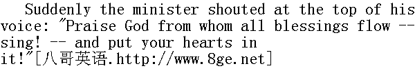 忽然牧师放开嗓音,高唱起来:"赞美上帝,保佑众生-- 唱!--大家尽情地唱呀!" And they did. Old Hundred swelled up with a triumphant burst, and while it shook the rafters Tom Sawyer the Pirate looked around upon the envying juveniles about him and confessed in his heart that this was the proudest moment of his life. 大家果然热情地唱了起来。人们以饱满的热情,大声唱起了颂歌,歌声回荡在教堂上空。海盗汤姆·索亚向四周张望,发现周围的伙伴们都在羡慕他,心中暗自承认,这是他平生最得意的时刻。 As the "sold" congregation trooped out they said they would almost be willing to be made ridiculous again to hear Old Hundred sung like that once more. 当那些"受骗"的参加葬礼的人成群结对地走出教堂时,大家都说要是能像今天这样热情地唱颂歌,情愿再被捉弄一次。 Tom got more cuffs and kisses that day -- according to Aunt Polly's varying moods -- than he had earned before in a year; and he hardly knew which expressed the most gratefulness to God and affection for himself. 那一天,汤姆不是挨耳光就是受亲吻,这全随波莉姨妈的心情变化而定。他从前一年所受的加起来也没有今天一天的多。他简直搞不清哪一种表示是对上帝的感激,哪一种是对他的爱。 |
