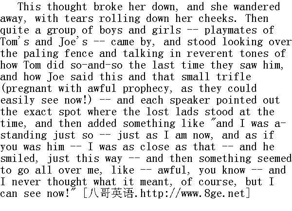 也就是在同一个星期六的下午,镇上虽然宁静,但人们的心情却很沉重。哈帕家和波莉姨妈家都沉浸在悲哀之中,哭声不断。说实话,镇上本来已经够宁静的了,现在静得更加异乎寻常。村里的人干活时都心不在焉,也很少说话,只是长吁短叹个不停。周六似乎也成了孩子们的负担。他们做游戏时,总也提不起精神,到后来干脆不玩了。 In the afternoon Becky Thatcher found herself moping about the deserted schoolhouse yard, and feeling very melancholy. But she found nothing there to comfort her. She soliloquized: 那天下午,贝基·撒切尔在空无一人的学校操场上,愁眉苦脸地踱来踱去,心里觉得很凄凉,但找不到什么可以安慰自己的东西,于是她一边步一边喃喃自语道: "Oh, if I only had a brass andiron-knob again! But I haven't got anything now to remember him by." And she choked back a little sob. " 哦,我要是再能得到那只柴架上的铜把手就好了!现在我连一件纪念他的东西都没有。" Presently she stopped, and said to herself: 她强忍着泪水。过了一会,她停住脚步,自言自语道: "It was right here. Oh, if it was to do over again, I wouldn't say that -- I wouldn't say it for the whole world. But he's gone now; I'll never, never, never see him any more." " 就是在这儿。哦,要是他再给我一次的话,我决不会像上回那样固执了,无论如何也不会再像上回那样说话了。可是他现在已经去了,我将永远、永远再也见不到他了。"