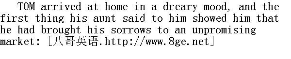 汤姆闷闷不乐地回到家里。姨妈一见他就数落了他一通,他感到就是回家也不一定能减轻他的苦楚。 "Tom, I've a notion to skin you alive!" " 汤姆呀,汤姆,我想活剥了你!" "Auntie, what have I done?" " 姨妈,我怎么了?" "Well, you've done enough. Here I go over to Sereny Harper, like an old softy, expecting I'm going to make her believe all that rubbage about that dream, when lo and behold you she'd found out from Joe that you was over here and heard all the talk we had that night. Tom, I don't know what is to become of a boy that will act like that. It makes me feel so bad to think you could let me go to Sereny Harper and make such a fool of myself and never say a word." " 瞧,你作得够呛。都是因为你,我呆头呆脑地跑去找赛伦尼·哈帕,像个老傻瓜似的,指望能让她相信你编的那个鬼梦。可是你瞧,她早就从乔那里了解到那天晚上你回过家,听见了我们所说的一切。汤姆,我不知道像你这样的孩子将来会怎么样。都是因为你,我才到赛伦尼·哈帕那儿去,出尽了洋相。一想到这,我就很伤心。" This was a new aspect of the thing. His smartness of the morning had seemed to Tom a good joke before, and very ingenious. It merely looked mean and shabby now. He hung his head and could not think of anything to say for a moment. Then he said: 汤姆没想到事情会闹到这种地步。他本以为早上耍的小聪明只是玩笑,很有独创性,可现在看来那既卑鄙又可耻。他先是垂下头,无言以对,然后开口说: