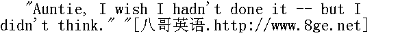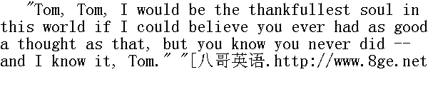 姨妈,我希望那不是我干的,不过我没想到……" "Oh, child, you never think. You never think of anything but your own selfishness. You could think to come all the way over here from Jackson's Island in the night to laugh at our troubles, and you could think to fool me with a lie about a dream; but you couldn't ever think to pity us and save us from sorrow." " 是的,孩子,你从来不动脑筋,只想着自己。你能想到夜里从杰克逊岛那么大老远地跑来幸灾乐祸;你能想到编梦撒谎来糊弄我,可你就想不到来告诉我们你还活着并没有死。你知道我们当时是多么伤心吗?" "Auntie, I know now it was mean, but I didn't mean to be mean. I didn't, honest. And besides, I didn't come over here to laugh at you that night." " 姨妈,我现在知道了,那样做太卑鄙。可是我不是存心要卑鄙的,真的,我不是存心的。还有,那天夜里我到这里来不是要来看笑话的。" "What did you come for, then?" " 那么,你到这里来干什么呢?" "It was to tell you not to be uneasy about us, because we hadn't got drownded." " 是来告诉你们别为我操心,因为我们并没有淹死。"