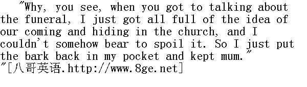 哎,你瞧,我听你说要给我们举行葬礼,我满心都想着要跑到教堂里躲起来,我舍不得不这么干。所以,我把树皮又放到口袋里,没有出来说。" "What bark?" " 什么树皮?" "The bark I had wrote on to tell you we'd gone pirating. I wish, now, you'd waked up when I kissed you -- I do, honest." " 上面写着我们去当海盗的那块树皮。唉,我当时吻你的时候,你要是醒了就好了。真的,我真是这样希望的。" The hard lines in his aunt's face relaxed and a sudden tenderness dawned in her eyes. 姨妈绷紧的脸一下子松开了,她眼里突然闪现出慈祥的目光。 "Did you kiss me, Tom?" " 你吻了我,汤姆?"