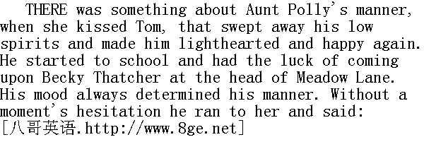 波莉姨妈吻汤姆的时候,态度有所变化,所以汤姆马上感到振作起来,心情轻松愉快。他上学去了。半路上在草坪巷口,他有幸碰上了贝基·撒切尔,他现在情绪好了,所以态度也来了个一百八十度大拐弯。于是他毫不犹豫地跑上前去说: "I acted mighty mean to-day, Becky, and I'm so sorry. I won't ever, ever do that way again, as long as ever I live -- please make up, won't you?" " 贝基,我很抱歉,今天那样做实在对不起人。你放心,就是死了,我也不会再那样了。我们和好吧!" The girl stopped and looked him scornfully in the face: 贝基停下脚步,一副鄙视的样子盯着他。 "I'll thank you to keep yourself to yourself, Mr. Thomas Sawyer. I'll never speak to you again." " 托马斯·索亚先生,你自己好自为之吧,我这先谢谢你了。我不会再跟你讲话的。" She tossed her head and passed on. Tom was so stunned that he had not even presence of mind enough to say "Who cares, Miss Smarty?" until the right time to say it had gone by. So he said nothing. But he was in a fine rage, nevertheless. He moped into the schoolyard wishing she were a boy, and imagining how he would trounce her if she were. He presently encountered her and delivered a stinging remark as he passed. She hurled one in return, and the angry breach was complete. It seemed to Becky, in her hot resentment, that she could hardly wait for school to "take in," she was so impatient to see Tom flogged for the injured spelling-book. If she had had any lingering notion of exposing Alfred Temple, Tom's offensive fling had driven it entirely away. 说完,她昂起头走了。汤姆一下子被说懵了,等他转过神来要反驳一声"去你的吧,自以为是小姐"时,为时已晚。他虽然没说什么,却窝了一肚子的火。他没精打采地走进校园,心里想贝基要是个男孩子,他非得很很地揍她一顿不可。两人在随后的相遇中,汤姆说了句刺耳的话就走了,贝基也回敬了一句,这一下两人算是彻底地决裂了。盛怒之下,贝基想起了汤姆书上的墨水,她好像急不可耐,盼望着汤姆早一点受到惩罚。她本来还有点犹豫不决,说不定还想要揭发那是阿尔弗雷德·邓波尔干的坏事,可汤姆那句刺耳的话一下子打消了贝基的这个念头。
