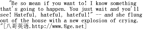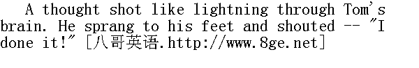 这时,汤姆的脑海里雷电般闪出一个念头,他猛然起身,大声说道:"是我干的!" The school stared in perplexity at this incredible folly. Tom stood a moment, to gather his dismembered faculties; and when he stepped forward to go to his punishment the surprise, the gratitude, the adoration that shone upon him out of poor Becky's eyes seemed pay enough for a hundred floggings. Inspired by the splendor of his own act, he took without an outcry the most merciless flaying that even Mr. Dobbins had ever administered; and also received with indifference the added cruelty of a command to remain two hours after school should be dismissed -- for he knew who would wait for him outside till his captivity was done, and not count the tedious time as loss, either. 全班同学迷惑不解地盯着汤姆,觉得他行为愚蠢,令人不可思议。汤姆站了一会好像是在镇定自己,然后走上前去接受惩罚。汤姆发现那个可怜的姑娘贝基眼里先是流露出吃惊,然后是感激,最后是敬慕之情,他觉得为此就是挨上一百鞭也是值得的。汤姆也为自己的义举感到脸上有光,因此在遭受杜宾斯先生有史以来最严酷的鞭笞时,他哼都没哼一声,另外放学后,他还得被罚站两小时。对这一残忍的做法,他也不在乎,因为他心里有数,外面会有个人心甘情愿地一直在等上他两个小时。 Tom went to bed that night planning vengeance against Alfred Temple; for with shame and repentance Becky had told him all, not forgetting her own treachery; but even the longing for vengeance had to give way, soon, to pleasanter musings, and he fell asleep at last with Becky's latest words lingering dreamily in his ear -- 当天晚上,汤姆临上床睡觉前合计着如何报复阿尔弗雷德·邓波尔。贝基把自己的背叛以及泼墨水的事情全盘托出了。可是不久,汤姆的思绪转到一些美滋滋的事情上。想着想着,汤姆耳边朦朦胧胧地响起了贝基刚才说过的一句话:"汤姆,你思想怎么会这样高尚的 "Tom, how could you be so noble!" 呀!"就这样,他终于进入了梦乡。 |