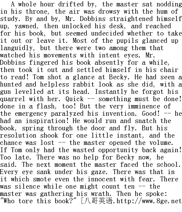 一个小时过去了,老师坐在他的座位上打盹,教室里一片嗡嗡的读书声令人困乏。渐渐地,杜宾斯先生挺直身子,打着哈欠,然后打开抽屉的锁,可手伸出半截又停下来,犹豫不决。大多数学生都漫不经心地抬起头看了一眼,但其中有两个人特别关注老师的一举一动。杜宾斯先生把手伸进抽屉随便地摸了一会就拿出书,身体往椅子一靠看起来。汤姆瞥了贝基一眼。她就像一只被猎人追捕的兔子,当猎枪瞄准它的头部时,一副绝望无救的可怜相,他立刻忘掉了他们之间的争吵。得采取行动,马上就干,越快越好。常言说得好,急中生智,可汤姆这回却束手无策,对,就这么办。他突然来了灵感:他要冲上去,一把从老师手里抢过书,夺门而逃。可是他一走神,就这么稍一犹豫的时候,老师翻开了书。汤姆坐失了良机,他十分后悔。这下完了,干什么也来不及了,想帮的忙也帮不上了。老师打开书后马上面朝大家。见老师盯着他们,大家都低下了头,就连没有犯错误的同学也都吓得不得了。大约有十秒钟,教室里一片寂静。老师的气是越来越大,他终于开了腔: "这书是谁撕的?" There was not a sound. One could have heard a pin drop. The stillness continued; the master searched face after face for signs of guilt. 教室里鸦雀无声,静的连根针掉到地上都能听见。老师见无人应答,就挨个检查,看到底是谁撕了书。 "Benjamin Rogers, did you tear this book?" " 本杰明·罗杰斯,书是你撕的吗?" A denial. Another pause. 老师得到的是否定,他停了一会问道: "Joseph Harper, did you?" " 约瑟夫·哈帕,是你干的?"