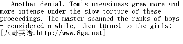 约瑟夫否认是他干的。老师不急不忙地问了这个又问那个。汤姆越来越紧张,显得烦躁不安。老师问完男生,稍加思索就转向女生。 "Amy Lawrence?" " 艾美·劳伦斯是你吗?" A shake of the head. 她同样也摇了摇头。 "Gracie Miller?" " 苏珊·哈帕,是你干的吗?" Another negative. The next girl was Becky Thatcher. Tom was trembling from head to foot with excitement and a sense of the hopelessness of the situation."Susan Harper, did you do this?""Rebecca Thatcher" [Tom glanced at her face -- it was white with terror] -- "did you tear -- no, look me in the face" [her hands rose in appeal] -- "did you tear this book?" 又是一个否认。下一个就该问到贝基·撒切尔了。汤姆十分紧张,他意识到情况不妙,吓得他从头到脚全身发抖。"瑞贝卡·撒切尔"(贝基的学名),"(汤姆向她脸上瞟了一眼,见她吓得脸色苍白)--"是你撕……不,看着我的眼睛。"(她承认地举起手来)--"是你撕坏了这本书吗?"