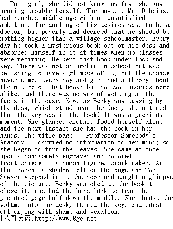 真是个可怜的姑娘,她就要大祸临头,自身难保了却一无所知。他们的老师,杜宾斯先生,虽然已到而立之年却心愿未了。他最热衷于当医生,可是贫穷却注定了他当不了别的美差,只能做一名乡村教师。他天天从讲台里拿出一本神秘的书,乘没课要讲的时候就潜心研读。平常,他总是小心翼翼地把那本书锁好。学校里那些调皮的家伙没有一个不想看下那本神秘的书,那怕瞟一眼也好,可总没有机会。至于那本书的内容,孩子们七嘴八舌,各抒己见,但都无法得到证实。讲台离门不远,贝基从旁边走过时恰好看到钥匙还在锁孔上晃悠。这可是看一上眼的好机会,千载难逢。她环顾回周,发现没有别的人在场,于是马上拿起那本书,只见扉页上写着"无名式教授解剖学"几个字。她没看出什么名堂来,于是就继续往下翻。刚一打开下一页,一张精制的彩色裸体图立即映入眼帘。与此同时,汤姆·索亚从门口进来,一眼瞥见了那张图。贝基一把抓起书想把它合上,可是不幸拦腰把那张图撕了一半。她马上把书扔进抽屉,锁上锁,又羞又恼地大哭起来。 "Tom Sawyer, you are just as mean as you can be, to sneak up on a person and look at what they're looking at." " 汤姆·索亚,你真卑鄙,偷看别人,还偷看人家正在看的东西。" "How could I know you was looking at anything?" " 我怎么知道你在看什么东西呢?" "You ought to be ashamed of yourself, Tom Sawyer; you know you're going to tell on me, and oh, what shall I do, what shall I do! I'll be whipped, and I never was whipped in school." " 汤姆·索亚,你应该感到害臊。你会告发我的,这下我该怎么办才好呢?我要挨鞭笞了,我可从没挨过鞭笞呀!" Then she stamped her little foot and said: 接着她跺着小脚说: