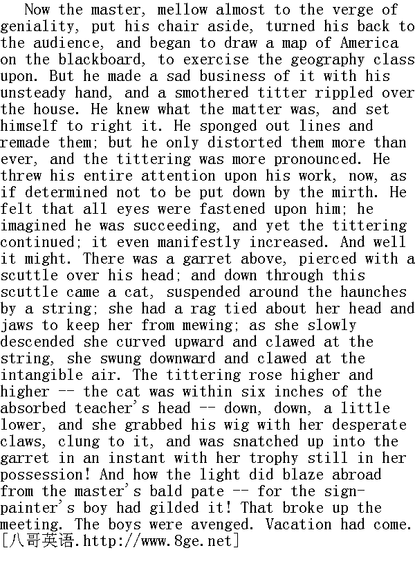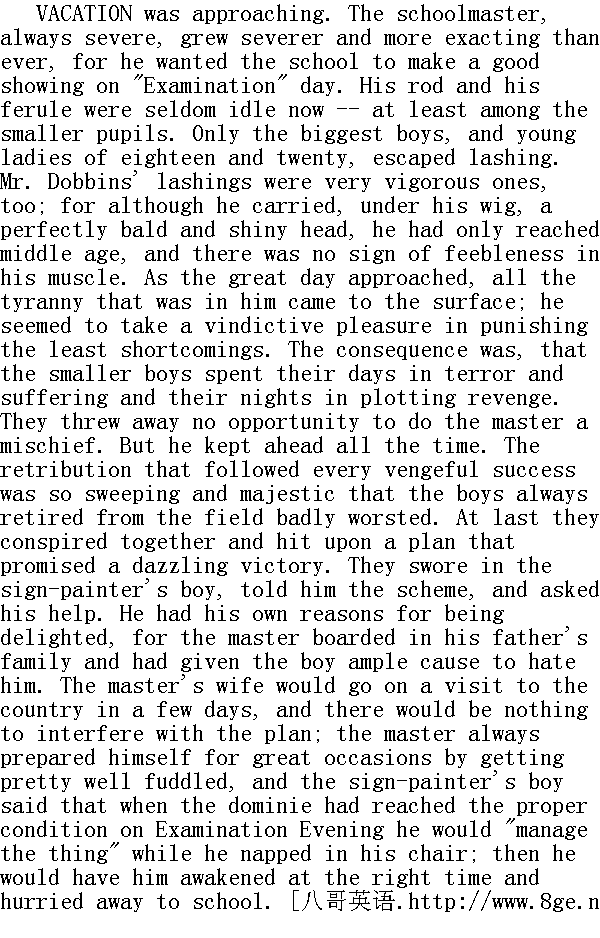 暑假即将来临,向来就严厉的老师现在变得比以往任何时候都更加严厉、越发苛刻了,他目的是要全体同学在考试的那一天好好表现一番。他手中的教鞭和戒尺现在很少闲着,至少对那些年龄较小的同学可以这么说。只有最大的男孩子和18到20岁的年轻姑娘才不挨打。杜宾斯先生的鞭子打起来特别重。别看他头戴假发,光秃着脑袋,可他刚到中年,身上的肌肉没有一点松弛的迹象。随着"大考"的临近,他的蛮劲渐渐暴露无遗。只要学生出了差错,哪怕是微不足道的小错,他也要乘机发挥,以惩罚学生来获取快感。结果这弄得那些年龄较小的男孩子惶惶不得终日,晚上就盘算着如何进行报复。他们一有空就捣蛋,从不放过任何给老师添乱子的机会。可老师仍然我行我素,不睬他们那一套。要是孩子们成功的话,随之而来的惩罚犹如风卷残云,威风凛凛,总是以孩子们的彻底失败而告终。但他们并不甘心失败,而是聚在一起密谋,最后终于想出了一条妙计,这一定能取得辉煌胜利。他们找到了做招牌人的孩子,先让他发誓保密,然后将他们的秘密计划告诉他,请他帮忙,这真是一拍即合。原来这位老师在他家吃饭,在很多事情上已经得罪了这个孩子。过几天,老师的太太要到乡下去串门,这样他们就能顺利地实施计划。另外,每逢重要日子,老师都要喝得酩酊大醉。那孩子说大考那天晚上,等老师差不多醉倒在椅子上打盹的时候,他就"乘机下手",然后再伺机弄醒他,催他快到学校去。 In the fulness of time the interesting occasion arrived. At eight in the evening the schoolhouse was brilliantly lighted, and adorned with wreaths and festoons of foliage and flowers. The master sat throned in his great chair upon a raised platform, with his blackboard behind him. He was looking tolerably mellow. Three rows of benches on each side and six rows in front of him were occupied by the dignitaries of the town and by the parents of the pupils. To his left, back of the rows of citizens, was a spacious temporary platform upon which were seated the scholars who were to take part in the exercises of the evening; rows of small boys, washed and dressed to an intolerable state of discomfort; rows of gawky big boys; snowbanks of girls and young ladies clad in lawn and muslin and conspicuously conscious of their bare arms, their grandmothers' ancient trinkets, their bits of pink and blue ribbon and the flowers in their hair. All the rest of the house was filled with non-participating scholars. 到了预定的时间,晚上8点钟,那个有趣的时刻终于来临了。 教室里灯火辉煌,挂着花环和彩带,彩带上扎着叶子和花朵。在高高的讲台上,老师像皇帝一样坐在那把大椅子里,身后就是黑板。还好他看上去不像大醉的样子。他前面有六排长凳,上面坐着镇上的要人。两边又各有三排长凳,坐的是学生家长。左前方,家长座位后面临时搭起了一个大讲台,参加晚上考试的考生全都坐在这里。一排排的小男孩被家长打扮得过了头,个个被洗得干干净净,穿得整整齐齐,让人觉得都有点不舒服。接着的是一排排大男孩,显得有些腼腆和呆板。再瞧那些小女孩和大姑娘,她们一身素装,洁白耀眼,个个穿着细麻软布做的衣服,头上插着许多装饰品,有鲜花,有粉红和蓝色相间的发带,还有老祖母传下来的各种小装饰物。她们露着胳膊站在那里,尤其显得有些局促不安。那些没有考试任务的学生都散坐在教室里别的地方。 The exercises began. A very little boy stood up and sheepishly recited, "You'd scarce expect one of my age to speak in public on the stage," etc. -- accompanying himself with the painfully exact and spasmodic gestures which a machine might have used -- supposing the machine to be a trifle out of order. But he got through safely, though cruelly scared, and got a fine round of applause when he made his manufactured bow and retired. 考试开始了。一个年龄小的男孩站起来按事先准备好的说:"大家可能没有想到,像我这年龄的孩子会到讲台上来当众演讲。"等等诸如此类的话。他边说边十分吃力地比划着,动作虽然准确,但却很生硬,生硬得像出了点故障的机器一般。他机械地鞠躬退场,获得了全场一阵热烈的鼓掌。 A little shamefaced girl lisped, "Mary had a little lamb," etc., performed a compassion-inspiring curtsy, got her meed of applause, and sat down flushed and happy. 一个小女孩脸通红口齿不清地背诵了"玛丽有只小羊羔"等,然后十分认真地行了个屈膝礼。在博得了大家的一阵掌声后,她红着脸,高兴地坐了下来。 Tom Sawyer stepped forward with conceited confidence and soared into the unquenchable and indestructible "Give me liberty or give me death" speech, with fine fury and frantic gesticulation, and broke down in the middle of it. A ghastly stage-fright seized him, his legs quaked under him and he was like to choke. True, he had the manifest sympathy of the house but he had the house's silence, too, which was even worse than its sympathy. The master frowned, and this completed the disaster. Tom struggled awhile and then retired, utterly defeated. There was a weak attempt at applause, but it died early. 汤姆·索亚十分自信地走上前去,背起了那千古名篇《不自由,毋宁死》。他慷慨陈词,不时还大幅度地做着手势, 可背着背着中途就接不上了。怯场症像魔鬼一样攫住了他,他两腿发颤,似乎有窒息之感。所有在场的人确实替他捏了把汗,可没人吭一声,这让他觉得比同情他更难受。到后来,老师皱起了眉头,汤姆这下全完了。他结结巴巴要往下背诵,可过了一会,便好像只斗败的公鸡一样溜下场去。台下的人